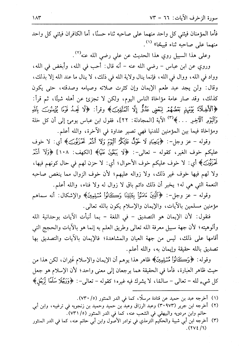 وروي عن ابن عَبَّاسٍ - رَضِيَ اللَّهُ عَنْهُ - أنه قال: أحب في اللَّه، وأبغض في اللَّه، وواد في اللَّه، ووال في اللَّه، فإنما ينال ولاية اللَّه في ذلك، لا ينال ما عند اللَّه إلا بذلك، وقال: ولن يجد عبد طعم الإيمان وإن كثرت صلاته وصيامه وصدقته، حتى يكون كذلك، وقد صار عامة مؤاخاة الناس اليوم، ولكن لا تجزئ عن أهله شيئًا، ثم قرأ: (الْأَخِلَّاءُ يَوْمَئِذٍ بَعْضُهُمْ لِبَعْضٍ عَدُوٌّ إِلَّا الْمُتَّقِينَ) وقرأ: (لَا تَجِدُ قَوْمًا يُؤْمِنُونَ بِاللَّهِ وَالْيَوْمِ الْآخِرِ يُوَادُّونَ مَنْ حَادَّ اللَّهَ وَرَسُولَهُ. . .) الآية، فقول ابن عَبَّاسٍ يومئ إلى أن كل خلة ومؤاخاة فيما بين المؤمنين للدنيا فهي تصير عداوة في الآخرة، واللَّه أعلم.