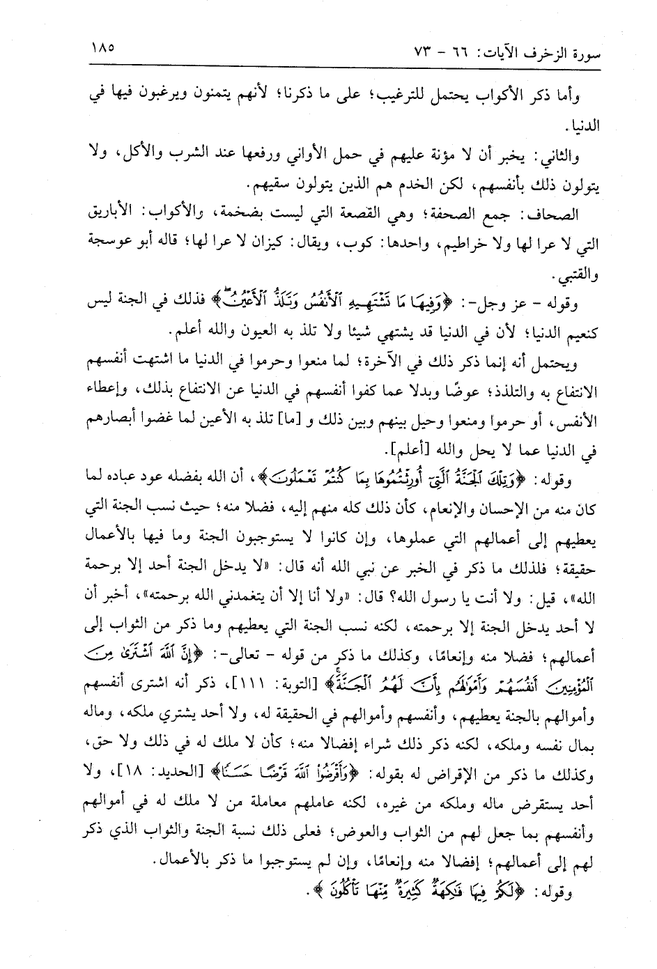 وقوله: (وَتِلْكَ الْجَنَّةُ الَّتِي أُورِثْتُمُوهَا بِمَا كُنْتُمْ تَعْمَلُونَ (72) أن اللَّه بفضله عود عباده لما كان منه من الإحسان والإنعام، كأن ذلك كله منهم إليه، فضلا منه؛ حيث نسب الجنة التي يعطيهم إلى أعمالهم التي عملوها، وإن كانوا لا يستوجبون الجنة وما فيها بالأعمال حقيقة؛ فلذلك ما ذكر في الخبر عن نبي اللَّه أنه قال: " لا يدخل الجنة أحد إلا برحمة اللَّه "، قيل: ولا أنت يا رسول اللَّه؟ قال: " ولا أنا إلا أن يتغمدني اللَّه برحمته "، أخبر أن لا أحد يدخل الجنة إلا برحمته، لكنه نسب الجنة التي يعطيهم وما ذكر من الثواب إلى أعمالهم؛ فضلا منه وإنعامًا، وكذلك ما ذكر من قوله - تعالى -: (إِنَّ اللَّهَ اشْتَرَى مِنَ الْمُؤْمِنِينَ أَنْفُسَهُمْ وَأَمْوَالَهُمْ بِأَنَّ لَهُمُ الْجَنَّةَ)، ذكر أنه اشترى أنفسهم وأموالهم بالجنة يعطيهم، وأنفسهم وأموالهم في الحقيقة له، ولا أحد يشتري ملكه، وماله بمال نفسه وملكه، لكنه ذكر ذلك شراء إفضالا منه؛ كأن لا ملك له في ذلك ولا حق، وكذلك ما ذكر من الإقراض له بقوله: (وَأَقْرِضُوا اللَّهَ قَرْضًا حَسَنًا)، ولا أحد يستقرض ماله وملكه من غيره، لكنه عاملهم معاملة من لا ملك له في أموالهم وأنفسهم بما جعل لهم من الثواب والعوض؛ فعلى ذلك نسبة الجنة والثواب الذي ذكر لهم إلى أعمالهم؛ إفضالا منه وإنعامًا، وإن لم يستوجبوا ما ذكر بالأعمال.