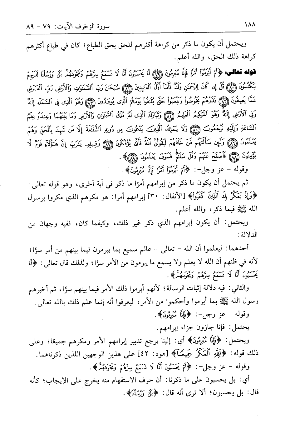 قوله تعالى: (أَمْ أَبْرَمُوا أَمْرًا فَإِنَّا مُبْرِمُونَ (79) أَمْ يَحْسَبُونَ أَنَّا لَا نَسْمَعُ سِرَّهُمْ وَنَجْوَاهُمْ بَلَى وَرُسُلُنَا لَدَيْهِمْ يَكْتُبُونَ (80) قُلْ إِنْ كَانَ لِلرَّحْمَنِ وَلَدٌ فَأَنَا أَوَّلُ الْعَابِدِينَ (81) سُبْحَانَ رَبِّ السَّمَاوَاتِ وَالْأَرْضِ رَبِّ الْعَرْشِ عَمَّا يَصِفُونَ (82) فَذَرْهُمْ يَخُوضُوا وَيَلْعَبُوا حَتَّى يُلَاقُوا يَوْمَهُمُ الَّذِي يُوعَدُونَ (83) وَهُوَ الَّذِي فِي السَّمَاءِ إِلَهٌ وَفِي الْأَرْضِ إِلَهٌ وَهُوَ الْحَكِيمُ الْعَلِيمُ (84) وَتَبَارَكَ الَّذِي لَهُ مُلْكُ السَّمَاوَاتِ وَالْأَرْضِ وَمَا بَيْنَهُمَا وَعِنْدَهُ عِلْمُ السَّاعَةِ وَإِلَيْهِ تُرْجَعُونَ (85) وَلَا يَمْلِكُ الَّذِينَ يَدْعُونَ مِنْ دُونِهِ الشَّفَاعَةَ إِلَّا مَنْ شَهِدَ بِالْحَقِّ وَهُمْ يَعْلَمُونَ (86) وَلَئِنْ سَأَلْتَهُمْ مَنْ خَلَقَهُمْ لَيَقُولُنَّ اللَّهُ فَأَنَّى يُؤْفَكُونَ (87) وَقِيلِهِ يَا رَبِّ إِنَّ هَؤُلَاءِ قَوْمٌ لَا يُؤْمِنُونَ (88) فَاصْفَحْ عَنْهُمْ وَقُلْ سَلَامٌ فَسَوْفَ يَعْلَمُونَ (89)