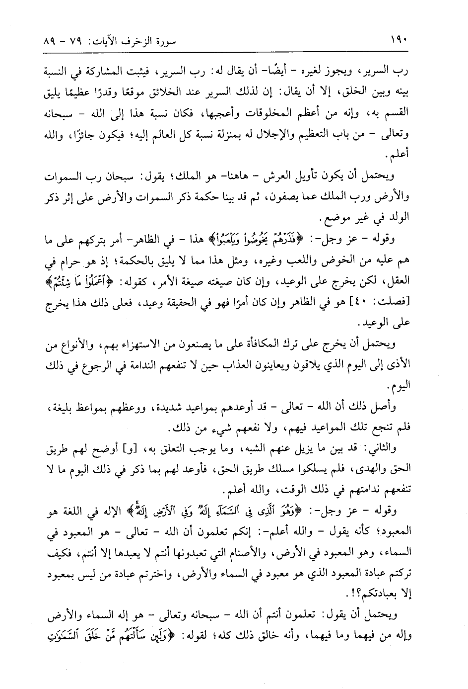 وقوله - عَزَّ وَجَلَّ -: (وَهُوَ الَّذِي فِي السَّمَاءِ إِلَهٌ وَفِي الْأَرْضِ إِلَهٌ وَهُوَ الْحَكِيمُ الْعَلِيمُ (84) الإله في اللغة هو المعبود؛ كأنه يقول - واللَّه أعلم -: إنكم تعلمون أن اللَّه - تعالى - هو المعبود في السماء، وهو المعبود في الأرض، والأصنام التي تعبدونها أنتم لا يعبدها إلا أنتم، فكيف تركتم عبادة المعبود الذي هو معبود في السماء والأرض، واخترتم عبادة من ليس بمعبود إلا بعبادتكم؟!.