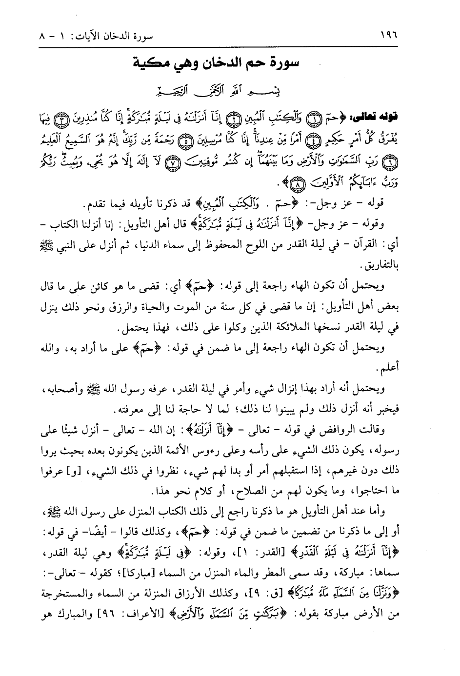 وأما عند أهل التأويل هو ما ذكرنا راجع إلى ذلك الكتاب المنزل على رسول اللَّه - صَلَّى اللَّهُ عَلَيهِ وَسَلَّمَ -، أو إلى ما ذكرنا من تضمين ما ضمن في قوله: (حم)، وكذلك قالوا - أيضًا - في قوله: (إِنَّا أَنْزَلْنَاهُ فِي لَيْلَةِ الْقَدْرِ)، وقوله: (فِي لَيْلَةٍ مُبَارَكَةٍ) هي ليلة القدر، سماها: مباركة، وقد سمى المطر والماء المنزل من السماء مباركا؛ كقوله - تعالى -: (وَنَزَّلْنَا مِنَ السَّمَاءِ مَاءً مُبَارَكًا)، وكذلك الأرزاق المنزلة من السماء والمستخرجة من الأرض مباركة بقوله: (بَرَكَاتٍ مِنَ السَّمَاءِ وَالْأَرْضِ)، والمبارك هو