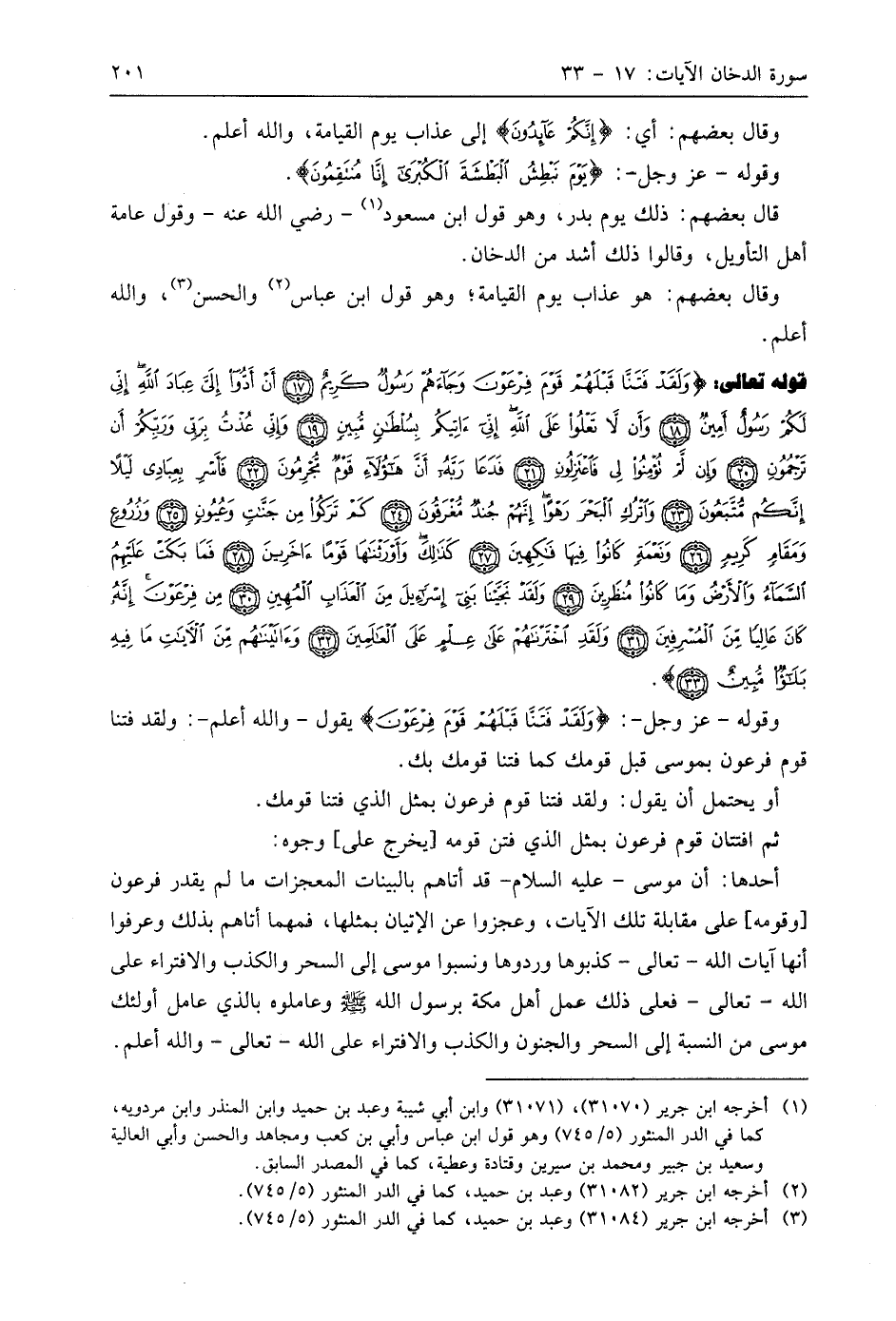 قوله تعالى: (وَلَقَدْ فَتَنَّا قَبْلَهُمْ قَوْمَ فِرْعَوْنَ وَجَاءَهُمْ رَسُولٌ كَرِيمٌ (17) أَنْ أَدُّوا إِلَيَّ عِبَادَ اللَّهِ إِنِّي لَكُمْ رَسُولٌ أَمِينٌ (18) وَأَنْ لَا تَعْلُوا عَلَى اللَّهِ إِنِّي آتِيكُمْ بِسُلْطَانٍ مُبِينٍ (19) وَإِنِّي عُذْتُ بِرَبِّي وَرَبِّكُمْ أَنْ تَرْجُمُونِ (20) وَإِنْ لَمْ تُؤْمِنُوا لِي فَاعْتَزِلُونِ (21) فَدَعَا رَبَّهُ أَنَّ هَؤُلَاءِ قَوْمٌ مُجْرِمُونَ (22) فَأَسْرِ بِعِبَادِي لَيْلًا إِنَّكُمْ مُتَّبَعُونَ (23) وَاتْرُكِ الْبَحْرَ رَهْوًا إِنَّهُمْ جُنْدٌ مُغْرَقُونَ (24) كَمْ تَرَكُوا مِنْ جَنَّاتٍ وَعُيُونٍ (25) وَزُرُوعٍ وَمَقَامٍ كَرِيمٍ (26) وَنَعْمَةٍ كَانُوا فِيهَا فَاكِهِينَ (27) كَذَلِكَ وَأَوْرَثْنَاهَا قَوْمًا آخَرِينَ (28) فَمَا بَكَتْ عَلَيْهِمُ السَّمَاءُ وَالْأَرْضُ وَمَا كَانُوا مُنْظَرِينَ (29) وَلَقَدْ نَجَّيْنَا بَنِي إِسْرَائِيلَ مِنَ الْعَذَابِ الْمُهِينِ (30) مِنْ فِرْعَوْنَ إِنَّهُ كَانَ عَالِيًا مِنَ الْمُسْرِفِينَ (31) وَلَقَدِ اخْتَرْنَاهُمْ عَلَى عِلْمٍ عَلَى الْعَالَمِينَ (32) وَآتَيْنَاهُمْ مِنَ الْآيَاتِ مَا فِيهِ بَلَاءٌ مُبِينٌ (33)