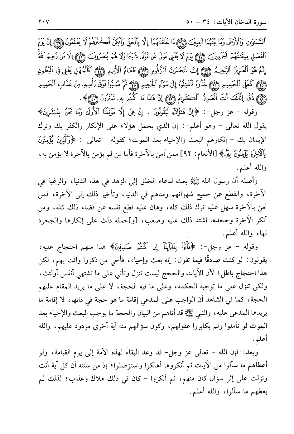 وقوله - عَزَّ وَجَلَّ -: (إِنَّ هَؤُلَاءِ لَيَقُولُونَ (34) إِنْ هِيَ إِلَّا مَوْتَتُنَا الْأُولَى وَمَا نَحْنُ بِمُنْشَرِينَ (35) يقول اللَّه تعالى - وهو أعلم -: إن الذي يحمل هَؤُلَاءِ على الإنكار والكفر بك وترك الإيمان بك - إنكارهم البعث والإحياء بعد الموت؛ كقوله - تعالى -: (وَالَّذِينَ يُؤْمِنُونَ بِالْآخِرَةِ يُؤْمِنُونَ بِهِ)، ممن آمن بالآخرة فأما من لم يؤمن بالآخرة لا يؤمن به، واللَّه أعلم.