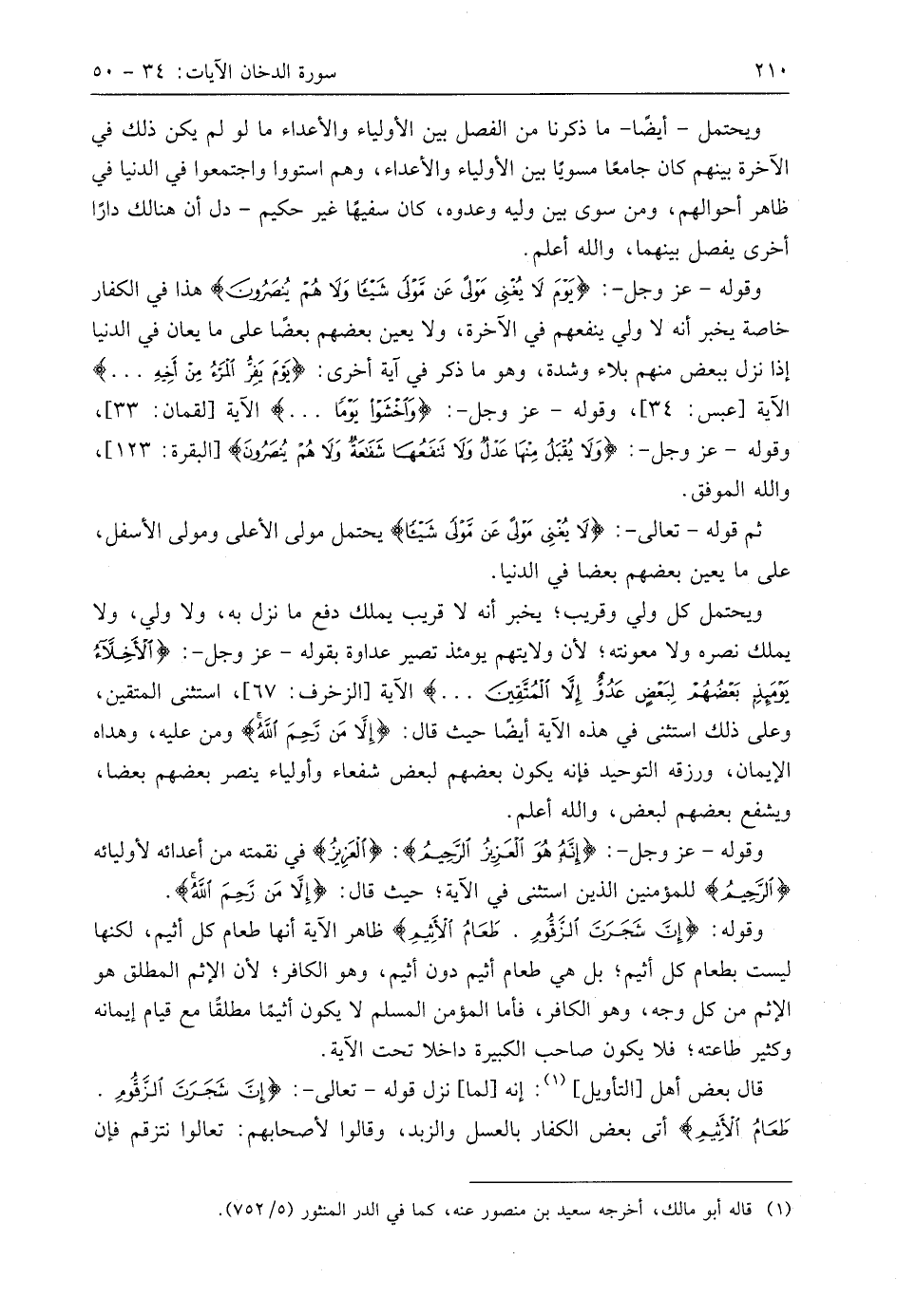 وقوله: (إِنَّ شَجَرَتَ الزَّقُّومِ (43) طَعَامُ الْأَثِيمِ (44) ظاهر الآية أنها طعام كل أثيم، لكنها ليست بطعام كل أثيم؛ بل هي طعام أثيم دون أثيم، وهو الكافر؛ لأن الإثم المطلق هو الإثم من كل وجه، وهو الكافر، فأما المؤمن المسلم لا يكون أثيمًا مطلقًا مع قيام إيمانه وكثير طاعته؛ فلا يكون صاحب الكبيرة داخلا تحت الآية.