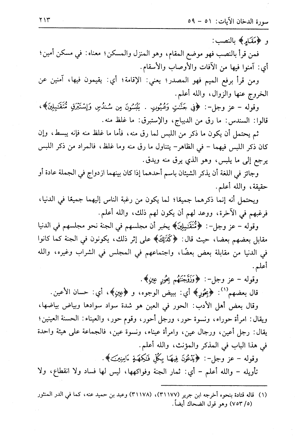 وقوله - عَزَّ وَجَلَّ -: (فِي جَنَّاتٍ وَعُيُونٍ (52) يَلْبَسُونَ مِنْ سُنْدُسٍ وَإِسْتَبْرَقٍ مُتَقَابِلِينَ (53)، قالوا: السندس: ما رق من الديباج، والإستبرق: ما غلظ منه.