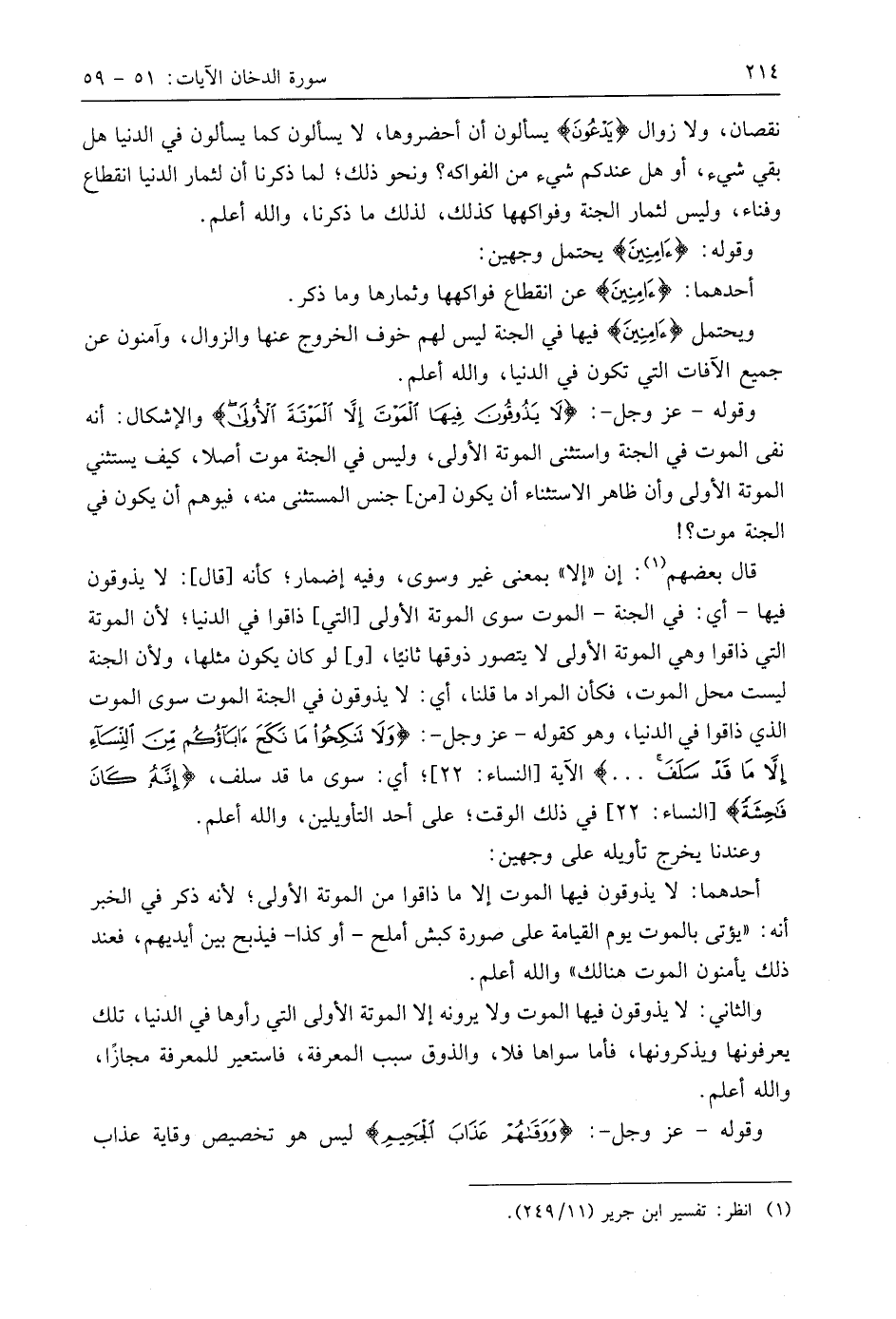 وقوله - عَزَّ وَجَلَّ -: (لَا يَذُوقُونَ فِيهَا الْمَوْتَ إِلَّا الْمَوْتَةَ الْأُولَى ... (56) والإشكال: أنه نفى الموت في الجنة واستثنى الموتة الأولى، وليس في الجنة موت أصلا، كيف يستثني الموتة الأولى وأن ظاهر الاستثناء أن يكون من جنس المستثنى منه، فيوهم أن يكون في الجنة موت؟!