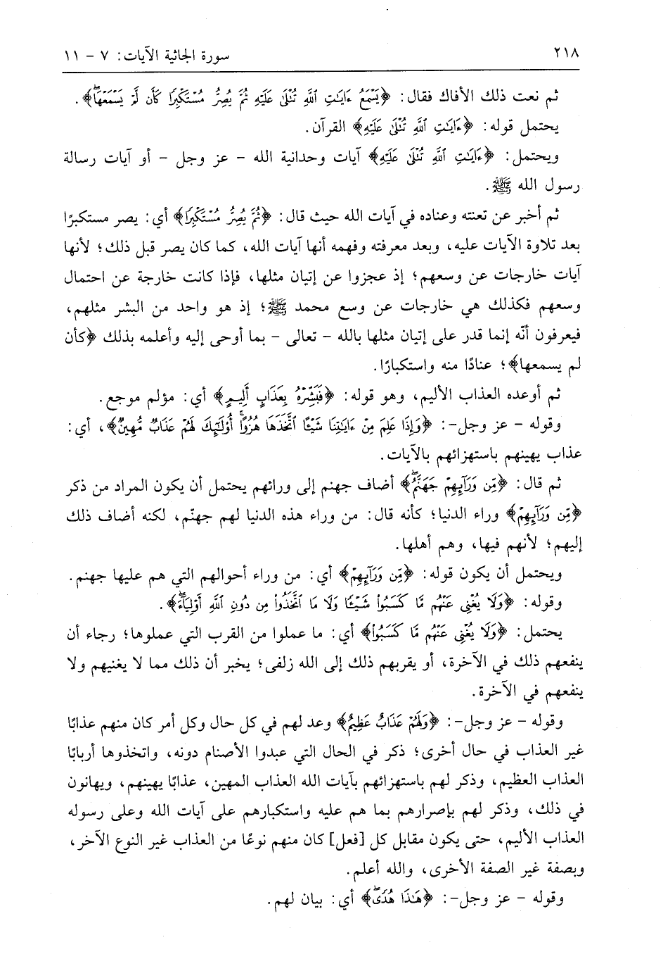 ثم نعت ذلك الأفاك فقال: (يَسْمَعُ آيَاتِ اللَّهِ تُتْلَى عَلَيْهِ ثُمَّ يُصِرُّ مُسْتَكْبِرًا كَأَنْ لَمْ يَسْمَعْهَا فَبَشِّرْهُ بِعَذَابٍ أَلِيمٍ (8).