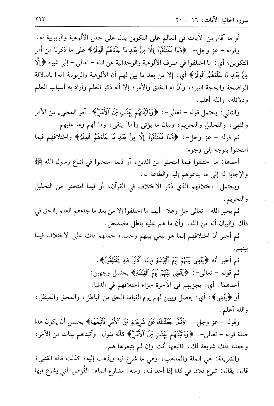 وقوله - عَزَّ وَجَلَّ -: (ثُمَّ جَعَلْنَاكَ عَلَى شَرِيعَةٍ مِنَ الْأَمْرِ فَاتَّبِعْهَا وَلَا تَتَّبِعْ أَهْوَاءَ الَّذِينَ لَا يَعْلَمُونَ (18) يحتمل أن يكون هذا صلة قوله - تعالى -: (وَآتَيْنَاهُمْ بَيِّنَاتٍ مِنَ الْأَمْرِ) كأنه يقول: وآتيناهم بينات من الأمر، وجعلنا ذلك شريعة لك، فاتبعها أنت وإن لم يتبعوها هم.