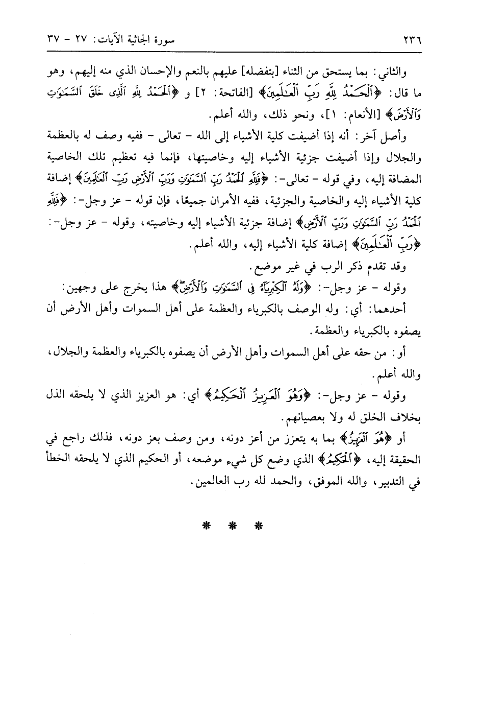 وقوله - عَزَّ وَجَلَّ -: (وَلَهُ الْكِبْرِيَاءُ فِي السَّمَاوَاتِ وَالْأَرْضِ وَهُوَ الْعَزِيزُ الْحَكِيمُ (37) هذا يخرج على وجهين: