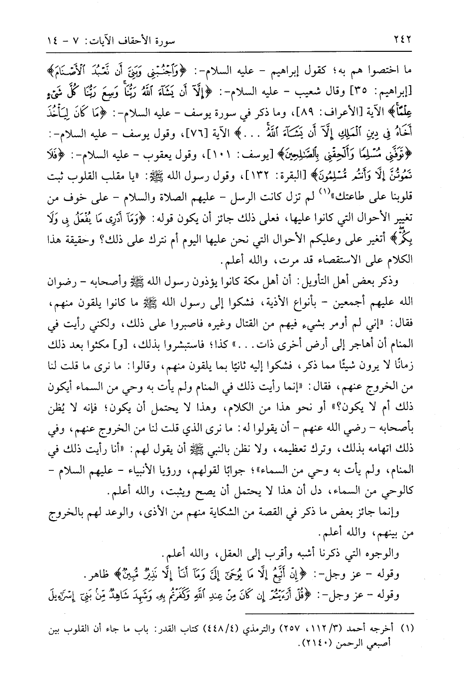 قلوبنا على طاعتك " لم تزل كانت الرسل - عليهم الصلاة والسلام - على خوف من تغيير الأحوال التي كانوا عليها، فعلى ذلك جائز أن يكون قوله: (وَمَا أَدْرِي مَا يُفْعَلُ بِي وَلَا بِكُمْ) أتغير عليَّ وعليكم الأحوال التي نحن عليها اليوم أم نترك على ذلك؟ وحقيقة هذا الكلام على الاستقصاء قد مرت، واللَّه أعلم.
