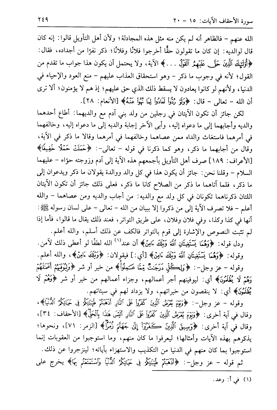 اللَّه عنهم - فالظاهر أنه لم يكن منه مثل هذه المجادلة؛ ولأن أهل التأويل قالوا: إنه كان قال لوالديه: إن كان ما تقولون حقًّا أخرجوا فلانًا وفلانًا؛ ذكر نفرًا من أجداده، فقال: (أُولَئِكَ الَّذِينَ حَقَّ عَلَيْهِمُ الْقَوْلُ. . .) الآية، ولا يحتمل أن يكون هذا جواب ما تقدم من القول؛ لأنه في وجوب ما ذكر -وهو استحقاق العذاب عليهم- منع العود والإحياء في الدنيا، ولأنهم لو كانوا يعادون لا يسقط ذلك الذي حق عليهم؛ إذ هم لا يؤمنون؛ ألا ترى أن اللَّه - تعالى - قال: (وَلَوْ رُدُّوا لَعَادُوا لِمَا نُهُوا عَنْهُ).