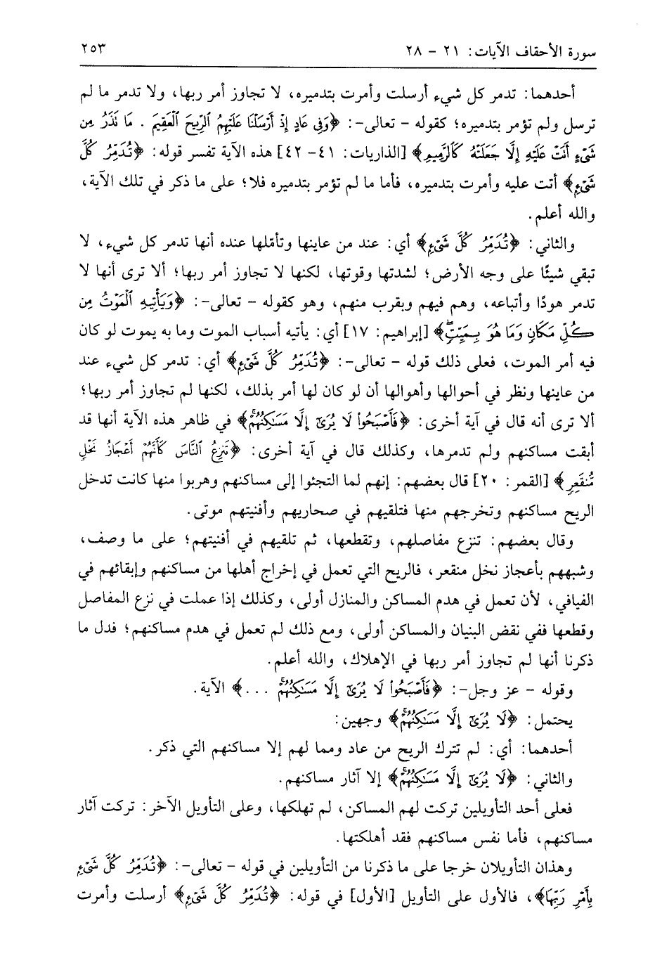 والثاني: (تُدَمِّرُ كُلَّ شَيْءٍ) أي: عند من عاينها وتأملها عنده أنها تدمر كل شيء، لا تبقي شيئًا على وجه الأرض؛ لشدتها وقوتها، لكنها لا تجاوز أمر ربها؛ ألا ترى أنها لا تدمر هودًا وأتباعه، وهم فيهم وبقرب منهم، وهو كقوله - تعالى -: (وَيَأْتِيهِ الْمَوْتُ مِنْ كُلِّ مَكَانٍ وَمَا هُوَ بِمَيِّتٍ) أي: يأتيه أسباب الموت وما به يموت لو كان فيه أمر الموت، فعلى ذلك قوله - تعالى -: (تُدَمِّرُ كُلَّ شَيْءٍ) أي: تدمر كل شيء عند من عاينها ونظر في أحوالها وأهوالها أن لو كان لها أمر بذلك، لكنها لم تجاوز أمر ربها؛ ألا ترى أنه قال في آية أخرى: (فَأَصْبَحُوا لَا يُرَى إِلَّا مَسَاكِنُهُمْ) في ظاهر هذه الآية أنها قد أبقت مساكنهم ولم تدمرها، وكذلك قال في آية أخرى: (تَنْزِعُ النَّاسَ كَأَنَّهُمْ أَعْجَازُ نَخْلٍ مُنْقَعِرٍ) قَالَ بَعْضُهُمْ: إنهم لما التجئوا إلى مساكنهم وهربوا منها كانت تدخل الريح مساكنهم وتخرجهم منها فتلقيهم في صحاريهم وأفنيتهم موتى.