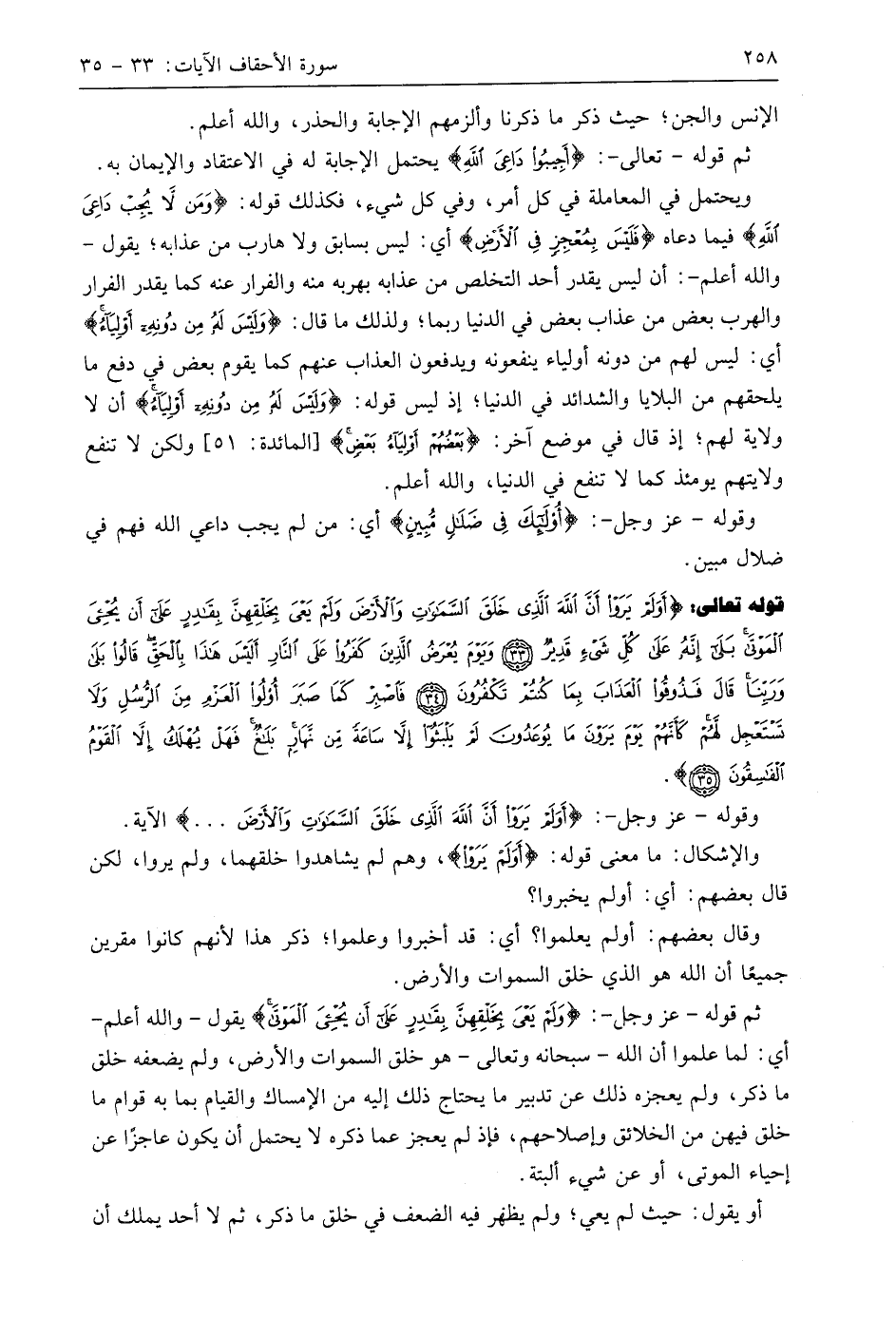 قوله تعالى: (أَوَلَمْ يَرَوْا أَنَّ اللَّهَ الَّذِي خَلَقَ السَّمَاوَاتِ وَالْأَرْضَ وَلَمْ يَعْيَ بِخَلْقِهِنَّ بِقَادِرٍ عَلَى أَنْ يُحْيِيَ الْمَوْتَى بَلَى إِنَّهُ عَلَى كُلِّ شَيْءٍ قَدِيرٌ (33) وَيَوْمَ يُعْرَضُ الَّذِينَ كَفَرُوا عَلَى النَّارِ أَلَيْسَ هَذَا بِالْحَقِّ قَالُوا بَلَى وَرَبِّنَا قَالَ فَذُوقُوا الْعَذَابَ بِمَا كُنْتُمْ تَكْفُرُونَ (34) فَاصْبِرْ كَمَا صَبَرَ أُولُو الْعَزْمِ مِنَ الرُّسُلِ وَلَا تَسْتَعْجِلْ لَهُمْ كَأَنَّهُمْ يَوْمَ يَرَوْنَ مَا يُوعَدُونَ لَمْ يَلْبَثُوا إِلَّا سَاعَةً مِنْ نَهَارٍ بَلَاغٌ فَهَلْ يُهْلَكُ إِلَّا الْقَوْمُ الْفَاسِقُونَ (35)