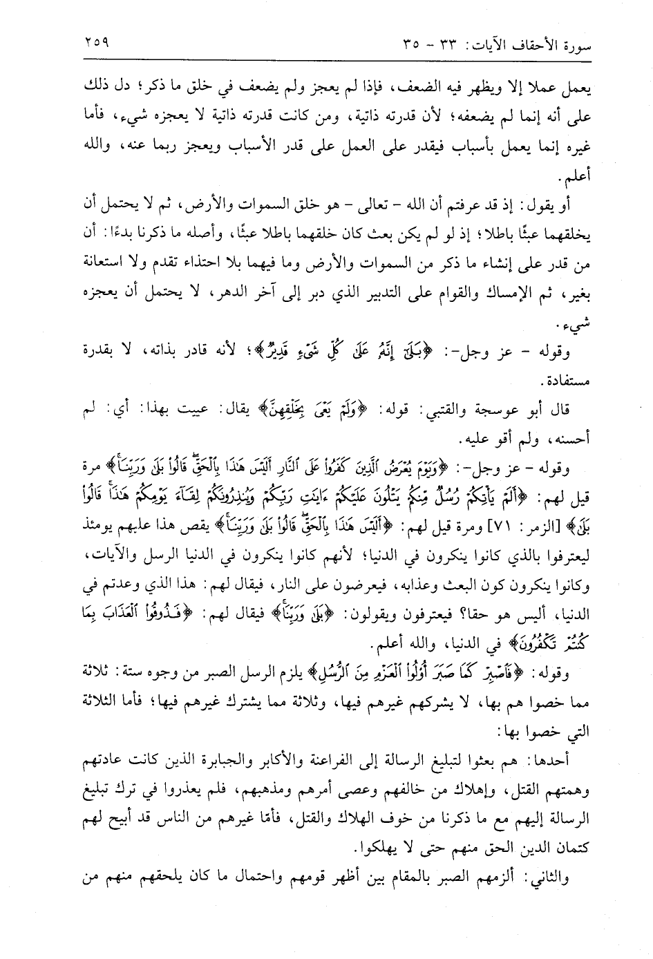 وقوله: (فَاصْبِرْ كَمَا صَبَرَ أُولُو الْعَزْمِ مِنَ الرُّسُلِ وَلَا تَسْتَعْجِلْ لَهُمْ كَأَنَّهُمْ يَوْمَ يَرَوْنَ مَا يُوعَدُونَ لَمْ يَلْبَثُوا إِلَّا سَاعَةً مِنْ نَهَارٍ بَلَاغٌ فَهَلْ يُهْلَكُ إِلَّا الْقَوْمُ الْفَاسِقُونَ (35) يلزم الرسل الصبر من وجوه ستة: ثلاثة مما خصوا هم بها، لا يشركهم غيرهم فيها، وثلاثة مما يشترك غيرهم فيها؛ فأما الثلاثة التي خصوا بها: