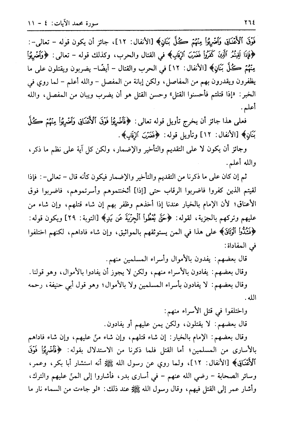 ثم إن كان على ما ذكرنا من التقديم والتأخير والإضمار فيكون كأنه قال - تعالى -: فإذا لقيتم الذين كفروا فاضربوا الرقاب حتى إذا أثخنتموهم وأسرتموهم، فاضربوا فوق الأعناق؛ لأن الإمام بالخيار عندنا إذا أخذهم وظفر بهم إن شاء قتلهم، وإن شاء منَّ عليهم وتركهم بالجزية، لقوله: (حَتَّى يُعْطُوا الْجِزْيَةَ عَنْ يَدٍ)، ويكون قوله: (فَشُدُّوا الْوَثَاقَ) على هذا في المنِّ يستوثقهم بالمواثيق، وإن شاء فاداهم، لكنهم اختلفوا في المفاداة: