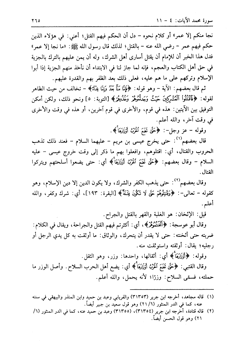قال بعضهم: حتى يخرج عيسى ابن مريم - عليهما السلام - فعند ذلك تذهب الحروب والقتال، أي: اقتلوهم، وافعلوا بهم ما ذكر إلى وقت خروج عيسى - عليه السلام - وقَالَ بَعْضُهُمْ: (حَتَّى تَضَعَ الْحَرْبُ أَوْزَارَهَا) أي: حتى يضعوا أسلحتهم ويتركوا القتال.
