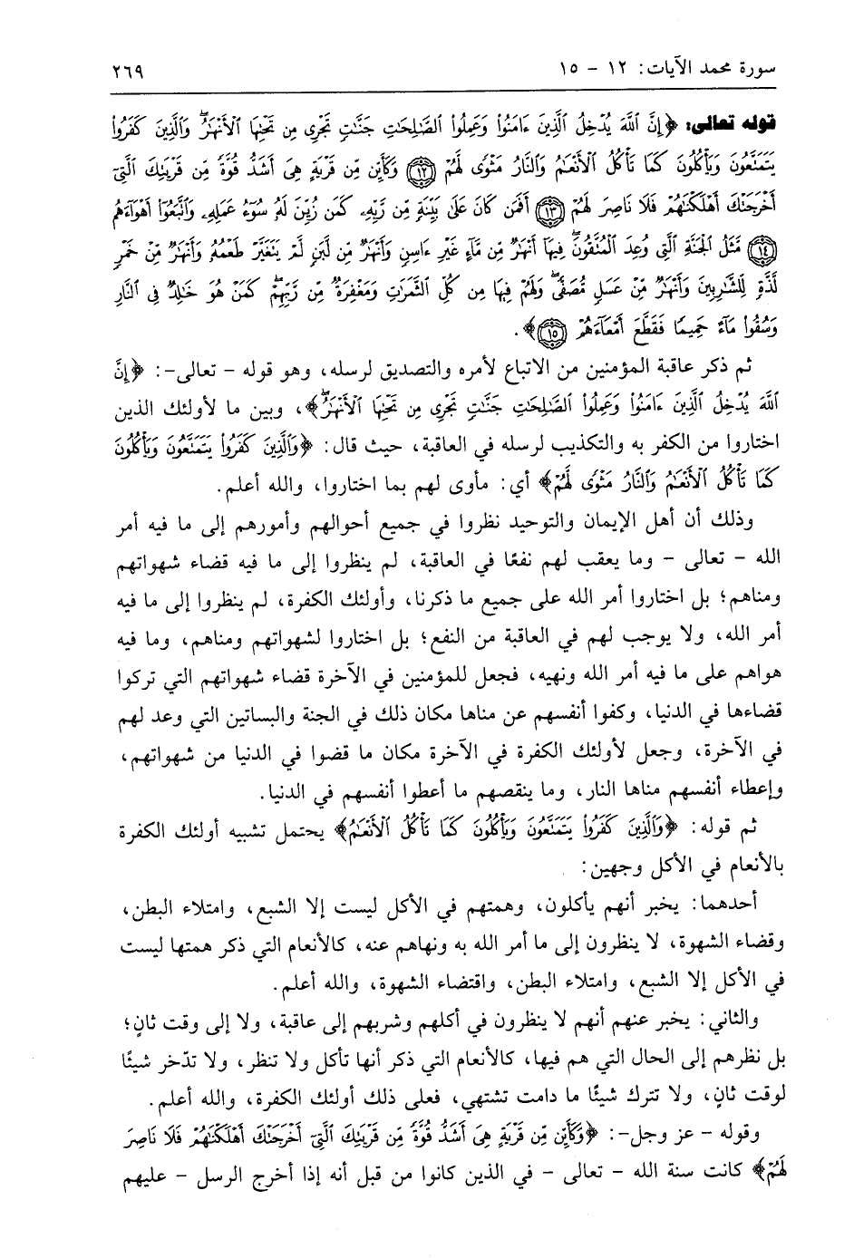 قوله تعالى: (إِنَّ اللَّهَ يُدْخِلُ الَّذِينَ آمَنُوا وَعَمِلُوا الصَّالِحَاتِ جَنَّاتٍ تَجْرِي مِنْ تَحْتِهَا الْأَنْهَارُ وَالَّذِينَ كَفَرُوا يَتَمَتَّعُونَ وَيَأْكُلُونَ كَمَا تَأْكُلُ الْأَنْعَامُ وَالنَّارُ مَثْوًى لَهُمْ (12) وَكَأَيِّنْ مِنْ قَرْيَةٍ هِيَ أَشَدُّ قُوَّةً مِنْ قَرْيَتِكَ الَّتِي أَخْرَجَتْكَ أَهْلَكْنَاهُمْ فَلَا نَاصِرَ لَهُمْ (13) أَفَمَنْ كَانَ عَلَى بَيِّنَةٍ مِنْ رَبِّهِ كَمَنْ زُيِّنَ لَهُ سُوءُ عَمَلِهِ وَاتَّبَعُوا أَهْوَاءَهُمْ (14) مَثَلُ الْجَنَّةِ الَّتِي وُعِدَ الْمُتَّقُونَ فِيهَا أَنْهَارٌ مِنْ مَاءٍ غَيْرِ آسِنٍ وَأَنْهَارٌ مِنْ لَبَنٍ لَمْ يَتَغَيَّرْ طَعْمُهُ وَأَنْهَارٌ مِنْ خَمْرٍ لَذَّةٍ لِلشَّارِبِينَ وَأَنْهَارٌ مِنْ عَسَلٍ مُصَفًّى وَلَهُمْ فِيهَا مِنْ كُلِّ الثَّمَرَاتِ وَمَغْفِرَةٌ مِنْ رَبِّهِمْ كَمَنْ هُوَ خَالِدٌ فِي النَّارِ وَسُقُوا مَاءً حَمِيمًا فَقَطَّعَ أَمْعَاءَهُمْ (15).