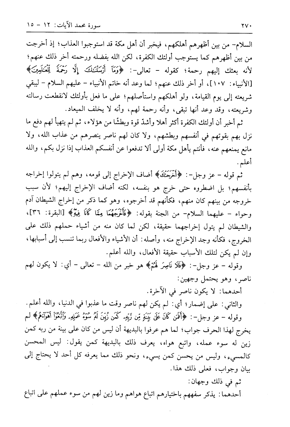 ثم قوله - عَزَّ وَجَلَّ -: (أَخْرَجَتْكَ) أضاف الإخراج إلى قومه، وهم لم يتولوا إخراجه بأنفسهم؛ بل اضطروه حتى خرج هو بنفسه، لكنه أضاف الإخراج إليهم؛ لأن سبب خروجه من بينهم كان منهم، فكأنهم قد أخرجوه، وهو كما ذكر من إخراج الشيطان آدم وحواء - عليهما السلام - من الجنة بقوله: (فَأَخْرَجَهُمَا مِمَّا كَانَا فِيهِ)، والشيطان لم يتول إخراجهما حقيقة، لكن لما كان منه من أشياء حملهم ذلك على الخروج، فكأنه وجد الإخراج منه، وأصله: أن الأشياء والأفعال ربما تنسب إلى أسبابها، وإن لم يكن لتلك الأسباب حقيقة الأفعال، واللَّه أعلم.