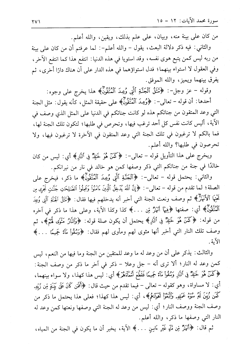 والثاني: يحتمل قوله - تعالى -: (الْجَنَّةِ الَّتِي وُعِدَ الْمُتَّقُونَ) ما ذكر، فيخرج على الصلة؛ لما تقدم من قوله - تعالى -: (إِنَّ اللَّهَ يُدْخِلُ الَّذِينَ آمَنُوا وَعَمِلُوا الصَّالِحَاتِ جَنَّاتٍ تَجْرِي مِنْ تَحْتِهَا الْأَنْهَارُ) ثم وصف ونعت الجنة التي أخبر أنه يدخلهم فيها فقال: (مَثَلُ الْجَنَّةِ الَّتِي وُعِدَ الْمُتَّقُونَ) أي: صفتها (فِيهَآ أَنهَارٌ مِنْ. . .) كذا وكذا الآية، وعلى هذا ما ذكر في آخره من قوله: (كَمَنْ هُوَ خَالِدٌ فِي النَّارِ) يحتمل أن يكون صلة قوله: (وَالنَّارُ مَثْوًى لَهُمْ)، ثم وصف تلك النار التي أخبر أنها مثوى لهم ومأوى لهم فقال: (وَسُقُوا مَآءً حمَيمًا. . .) الآية.