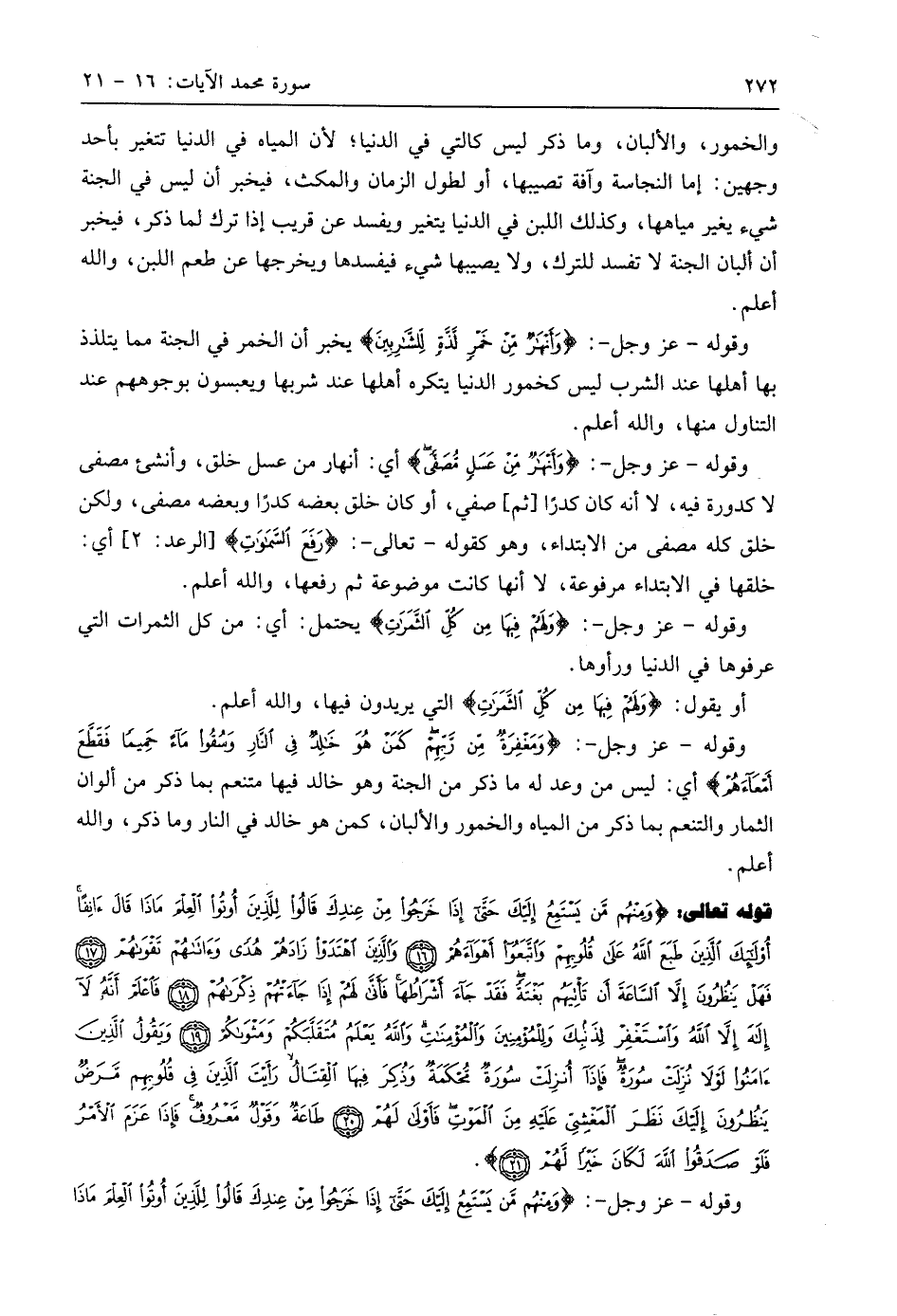 وقوله - عَزَّ وَجَلَّ -: (وَأَنْهَارٌ مِنْ خَمْرٍ لَذَّةٍ لِلشَّارِبِينَ) يخبر أن الخمر في الجنة مما يتلذذ بها أهلها عند الشرب ليس كخمور الدنيا يتكره أهلها عند شربها ويعبسون بوجوههم عند التناول منها، واللَّه أعلم.