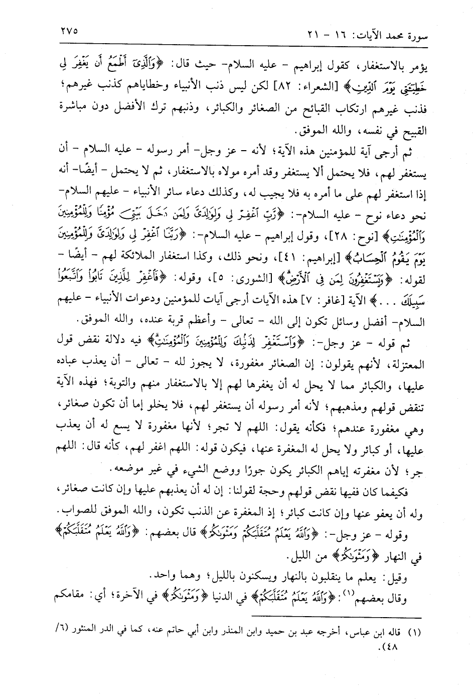ثم قوله - عَزَّ وَجَلَّ -: (وَاسْتَغْفِرْ لِذَنْبِكَ وَلِلْمُؤْمِنِينَ وَالْمُؤْمِنَاتِ) فيه دلالة نقض قول المعتزلة، لأنهم يقولون: إن الصغائر مغفورة، لا يجوز لله - تعالى - أن يعذب عباده عليها، والكبائر مما لا يحل له أن يغفرها لهم إلا بالاستغفار منهم والتوبة؛ فهذه الآية تنقض قولهم ومذهبهم؛ لأنه أمر رسوله أن يستغفر لهم، فلا يخلو إما أن تكون صغائر، وهي مغفورة عندهم؛ فكأنه يقول: اللهم لا تجر؛ لأنها مغفورة لا يسع له أن يعذب عليها، أو كبائر ولا يحل له المغفرة عنها، فيكون قوله: اللهم اغفر لهم، كأنه قال: اللهم جر؛ لأن مغفرته إياهم الكبائر يكون جورًا ووضع الشيء في غير موضعه.