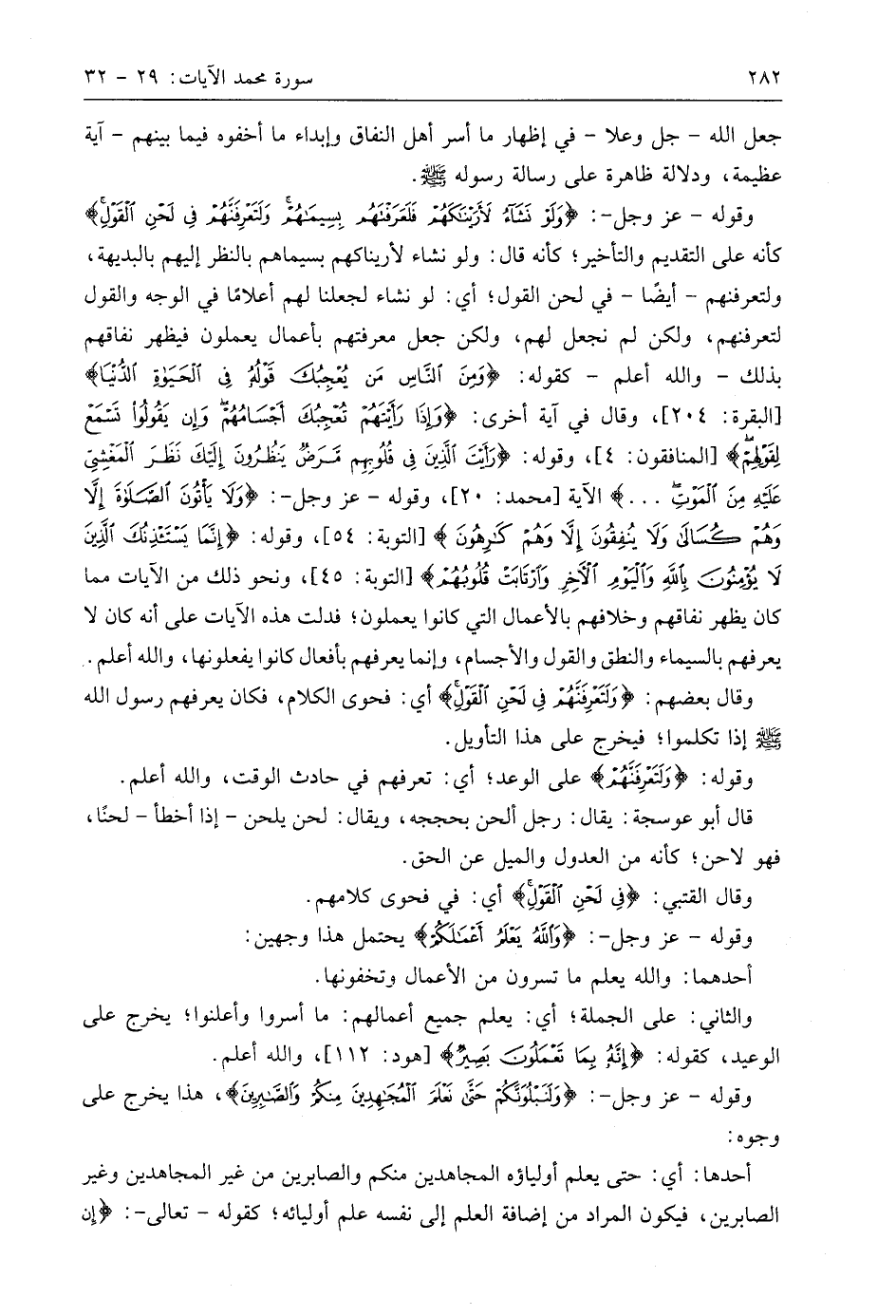 وقوله - عَزَّ وَجَلَّ -: (وَلَوْ نَشَاءُ لَأَرَيْنَاكَهُمْ فَلَعَرَفْتَهُمْ بِسِيمَاهُمْ وَلَتَعْرِفَنَّهُمْ فِي لَحْنِ الْقَوْلِ وَاللَّهُ يَعْلَمُ أَعْمَالَكُمْ (30) كأنه على التقديم والتأخير؛ كأنه قال: ولو نشاء لأريناكهم بسيماهم بالنظر إليهم بالبديهة، ولتعرفنهم - أيضًا - في لحن القول؛ أي: لو نشاء لجعلنا لهم أعلامًا في الوجه والقول لتعرفنهم، ولكن لم نجعل لهم، ولكن جعل معرفتهم بأعمال يعملون فيظهر نفاقهم بذلك - واللَّه أعلم - كقوله: (وَمِنَ النَّاسِ مَنْ يُعْجِبُكَ قَوْلُهُ فِي الْحَيَاةِ الدُّنْيَا)، وقال في آية أخرى: (وَإِذَا رَأَيْتَهُمْ تُعْجِبُكَ أَجْسَامُهُمْ وَإِنْ يَقُولُوا تَسْمَعْ لِقَوْلِهِمْ)، وقوله: (رَأَيْتَ الَّذِينَ فِي قُلُوبِهِمْ مَرَضٌ يَنْظُرُونَ إِلَيْكَ نَظَرَ الْمَغْشِيِّ عَلَيْهِ مِنَ الْمَوْتِ. . .) الآية، وقوله - عَزَّ وَجَلَّ -: (وَلَا يَأْتُونَ الصَّلَاةَ إِلَّا وَهُمْ كُسَالَى وَلَا يُنْفِقُونَ إِلَّا وَهُمْ كَارِهُونَ)، وقوله: (إِنَّمَا يَسْتَأْذِنُكَ الَّذِينَ لَا يُؤْمِنُونَ بِاللَّهِ وَالْيَوْمِ الْآخِرِ وَارْتَابَتْ قُلُوبُهُمْ)، ونحو ذلك من الآيات مما كان يظهر نفاقهم وخلافهم بالأعمال التي كانوا يعملون؛ فدلت هذه الآيات على أنه كان لا يعرفهم بالسيماء والنطق والقول والأجسام، وإنَّمَا يعرفهم بأفعال كانوا يفعلونها، واللَّه أعلم.
