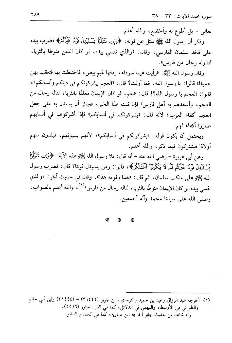 وعن أبي هريرة - رَضِيَ اللَّهُ عَنْهُ - أنه قال: تلا رسول اللَّه - صَلَّى اللَّهُ عَلَيهِ وَسَلَّمَ - هذه الآية: (وَإِنْ تَتَوَلَّوْا يَسْتَبْدِلْ قَوْمًا غَيْرَكُمْ ثُمَّ لَا يَكُونُوا أَمْثَالَكُمْ)، قالوا: ومن يستبدل قومًا؟ قال: فضرب رسول اللَّه - صَلَّى اللَّهُ عَلَيهِ وَسَلَّمَ - على منكب سلمان، ثم قال: " هذا وقومه هذا "، وقال في حديث آخر: " والذي نفسي بيده لو كان الإيمان منوطًا بالثريا، لناله رجال من فارس "، واللَّه أعلم بالصواب، وصلى اللَّه على سيدنا مُحَمَّد وآله أجمعين.