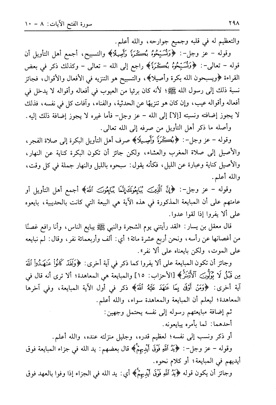 وقوله - عَزَّ وَجَلَّ -: (إِنَّ الَّذِينَ يُبَايِعُونَكَ إِنَّمَا يُبَايِعُونَ اللَّهَ يَدُ اللَّهِ فَوْقَ أَيْدِيهِمْ فَمَنْ نَكَثَ فَإِنَّمَا يَنْكُثُ عَلَى نَفْسِهِ وَمَنْ أَوْفَى بِمَا عَاهَدَ عَلَيْهُ اللَّهَ فَسَيُؤْتِيهِ أَجْرًا عَظِيمًا (10) أجمع أهل التأويل أو عامتهم على أن المبايعة المذكورة في هذه الآية هي البيعة التي كانت بالحديبية، بايعوه على ألا يفروا إذا لقوا عدوا.
