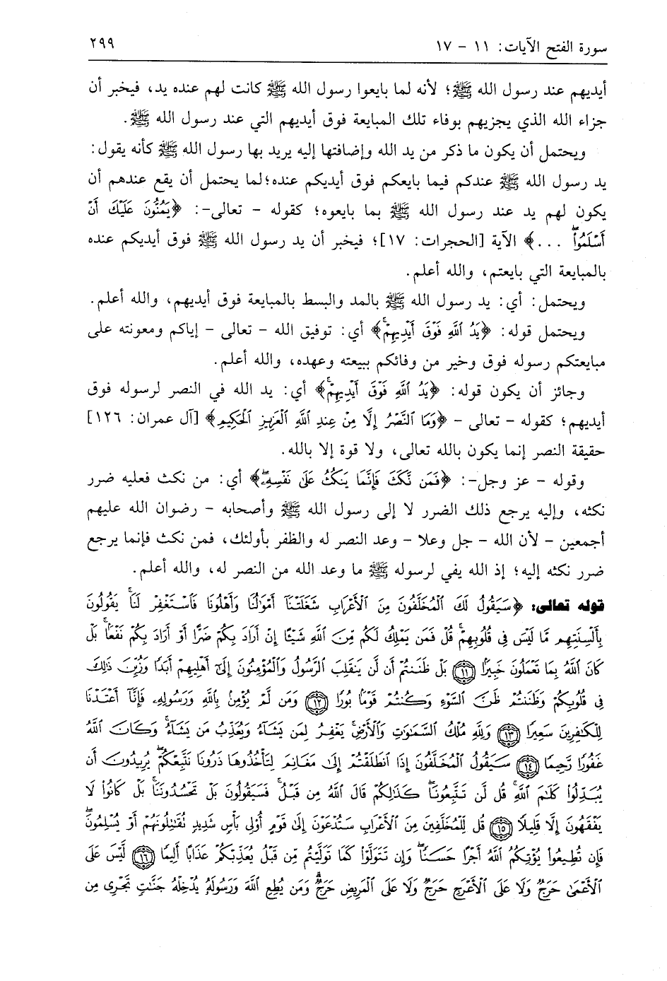 قوله تعالى: (سَيَقُولُ لَكَ الْمُخَلَّفُونَ مِنَ الْأَعْرَابِ شَغَلَتْنَا أَمْوَالُنَا وَأَهْلُونَا فَاسْتَغْفِرْ لَنَا يَقُولُونَ بِأَلْسِنَتِهِمْ مَا لَيْسَ فِي قُلُوبِهِمْ قُلْ فَمَنْ يَمْلِكُ لَكُمْ مِنَ اللَّهِ شَيْئًا إِنْ أَرَادَ بِكُمْ ضَرًّا أَوْ أَرَادَ بِكُمْ نَفْعًا بَلْ كَانَ اللَّهُ بِمَا تَعْمَلُونَ خَبِيرًا (11) بَلْ ظَنَنْتُمْ أَنْ لَنْ يَنْقَلِبَ الرَّسُولُ وَالْمُؤْمِنُونَ إِلَى أَهْلِيهِمْ أَبَدًا وَزُيِّنَ ذَلِكَ فِي قُلُوبِكُمْ وَظَنَنْتُمْ ظَنَّ السَّوْءِ وَكُنْتُمْ قَوْمًا بُورًا (12) وَمَنْ لَمْ يُؤْمِنْ بِاللَّهِ وَرَسُولِهِ فَإِنَّا أَعْتَدْنَا لِلْكَافِرِينَ سَعِيرًا (13) وَلِلَّهِ مُلْكُ السَّمَاوَاتِ وَالْأَرْضِ يَغْفِرُ لِمَنْ يَشَاءُ وَيُعَذِّبُ مَنْ يَشَاءُ وَكَانَ اللَّهُ غَفُورًا رَحِيمًا (14) سَيَقُولُ الْمُخَلَّفُونَ إِذَا انْطَلَقْتُمْ إِلَى مَغَانِمَ لِتَأْخُذُوهَا ذَرُونَا نَتَّبِعْكُمْ يُرِيدُونَ أَنْ يُبَدِّلُوا كَلَامَ اللَّهِ قُلْ لَنْ تَتَّبِعُونَا كَذَلِكُمْ قَالَ اللَّهُ مِنْ قَبْلُ فَسَيَقُولُونَ بَلْ تَحْسُدُونَنَا بَلْ كَانُوا لَا يَفْقَهُونَ إِلَّا قَلِيلًا (15) قُلْ لِلْمُخَلَّفِينَ مِنَ الْأَعْرَابِ سَتُدْعَوْنَ إِلَى قَوْمٍ أُولِي بَأْسٍ شَدِيدٍ تُقَاتِلُونَهُمْ أَوْ يُسْلِمُونَ فَإِنْ تُطِيعُوا يُؤْتِكُمُ اللَّهُ أَجْرًا حَسَنًا وَإِنْ تَتَوَلَّوْا كَمَا تَوَلَّيْتُمْ مِنْ قَبْلُ يُعَذِّبْكُمْ عَذَابًا أَلِيمًا (16) لَيْسَ عَلَى الْأَعْمَى حَرَجٌ وَلَا عَلَى الْأَعْرَجِ حَرَجٌ وَلَا عَلَى الْمَرِيضِ حَرَجٌ وَمَنْ يُطِعِ اللَّهَ وَرَسُولَهُ يُدْخِلْهُ جَنَّاتٍ تَجْرِي مِنْ