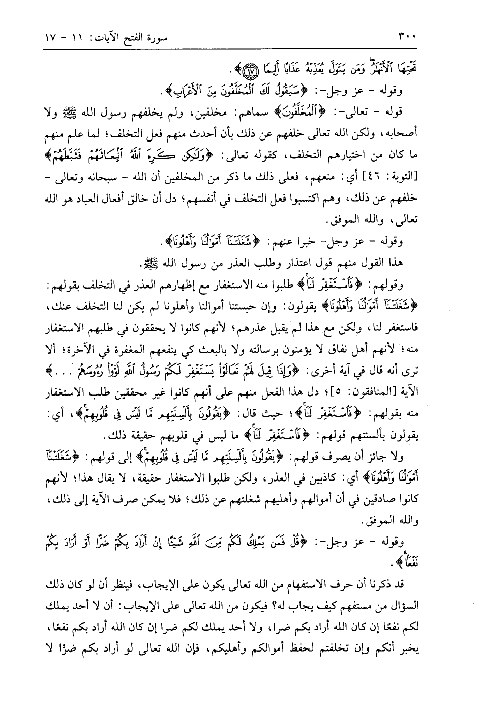 وقوله - عَزَّ وَجَلَّ -: (سَيَقُولُ لَكَ الْمُخَلَّفُونَ مِنَ الْأَعْرَابِ ... (11).