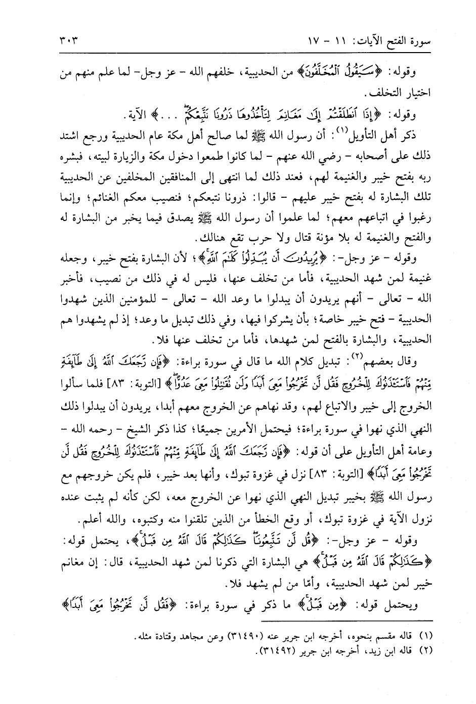 وقَالَ بَعْضُهُمْ: تبديل كلام اللَّه ما قال في سورة براءة: (فَإِنْ رَجَعَكَ اللَّهُ إِلَى طَائِفَةٍ مِنْهُمْ فَاسْتَأْذَنُوكَ لِلْخُرُوجِ فَقُلْ لَنْ تَخْرُجُوا مَعِيَ أَبَدًا)، فلما سألوا الخروج إلى خيبر والاتباع لهم، وقد نهاهم عن الخروج معهم أبدا، يريدون أن يبدلوا ذلك النهي الذي نهوا في سورة براءة؛ فيحتمل الأمرين جميعًا؛ كذا ذكر الشيخ - رحمه اللَّه - وعامة أهل التأويل على أن قوله: (فَإِنْ رَجَعَكَ اللَّهُ إِلَى طَائِفَةٍ مِنْهُمْ فَاسْتَأْذَنُوكَ لِلْخُرُوجِ فَقُلْ لَنْ تَخْرُجُوا مَعِيَ أَبَدًا)، نزل في غزوة تبوك، وأنها بعد خيبر، فلم يكن خروجهم مع رسول اللَّه - صَلَّى اللَّهُ عَلَيهِ وَسَلَّمَ - بخيبر تبديل النهي الذي نهوا عن الخروج معه، لكن كأنه لم يثبت عنده نزول الآية في غزوة تبوك، أو وقع الخطأ من الذين تلقنوا منه وكتبوه، واللَّه أعلم.