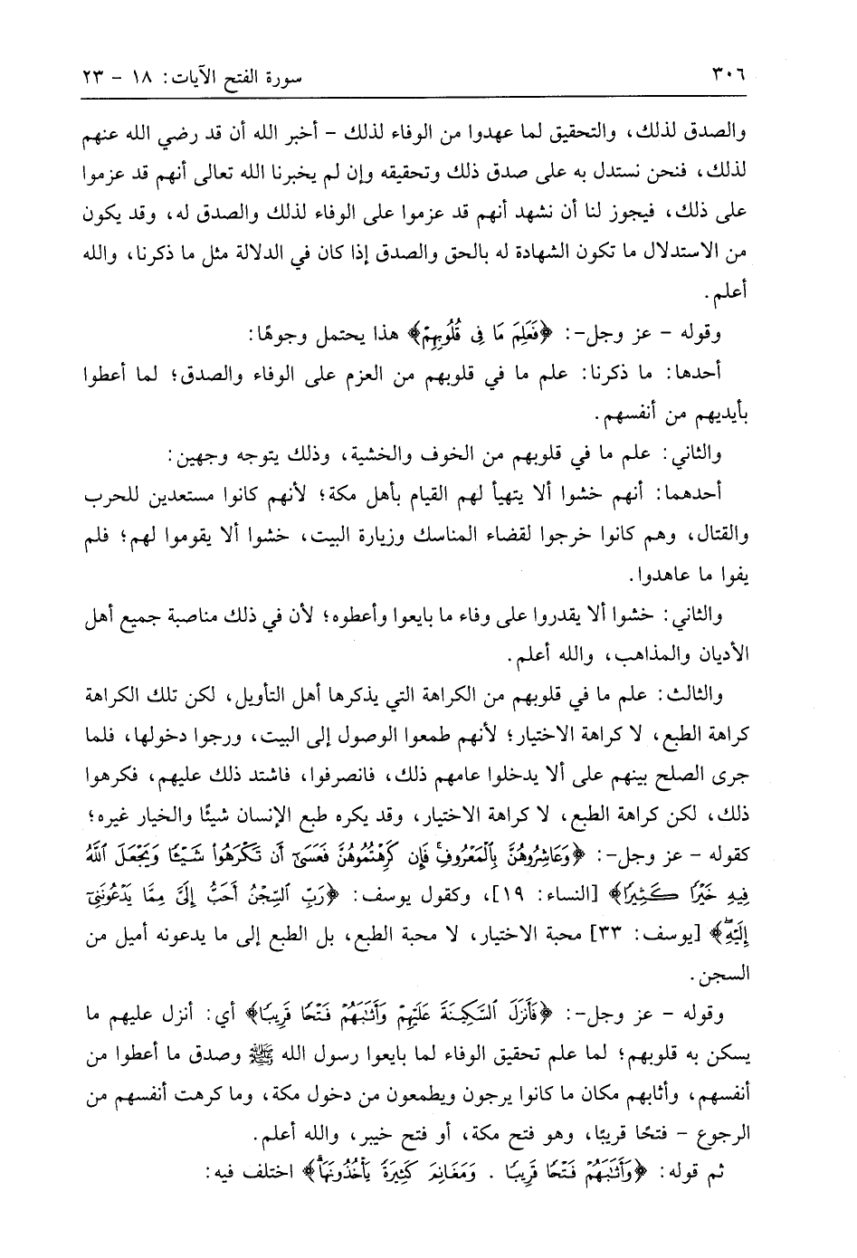 والثالث: علم ما في قلوبهم من الكراهة التي يذكرها أهل التأويل، لكن تلك الكراهة كراهة الطبع، لا كراهة الاختيار؛ لأنهم طمعوا الوصول إلى البيت، ورجوا دخولها، فلما جرى الصلح بينهم على ألا يدخلوا عامهم ذلك، فانصرفوا، فاشتد ذلك عليهم، فكرهوا ذلك، لكن كراهة الطبع، لا كراهة الاختيار، وقد يكره طبع الإنسان شيئًا والخيار غيره؛ كقوله - عَزَّ وَجَلَّ -: (وَعَاشِرُوهُنَّ بِالْمَعْرُوفِ فَإِنْ كَرِهْتُمُوهُنَّ فَعَسَى أَنْ تَكْرَهُوا شَيْئًا وَيَجْعَلَ اللَّهُ فِيهِ خَيْرًا كَثِيرًا)، وكقول يوسف: (رَبِّ السِّجْنُ أَحَبُّ إِلَيَّ مِمَّا يَدْعُونَنِي إِلَيْهِ)، محبة الاختيار، لا محبة الطبع، بل الطبع إلى ما يدعونه أميل من السجن.