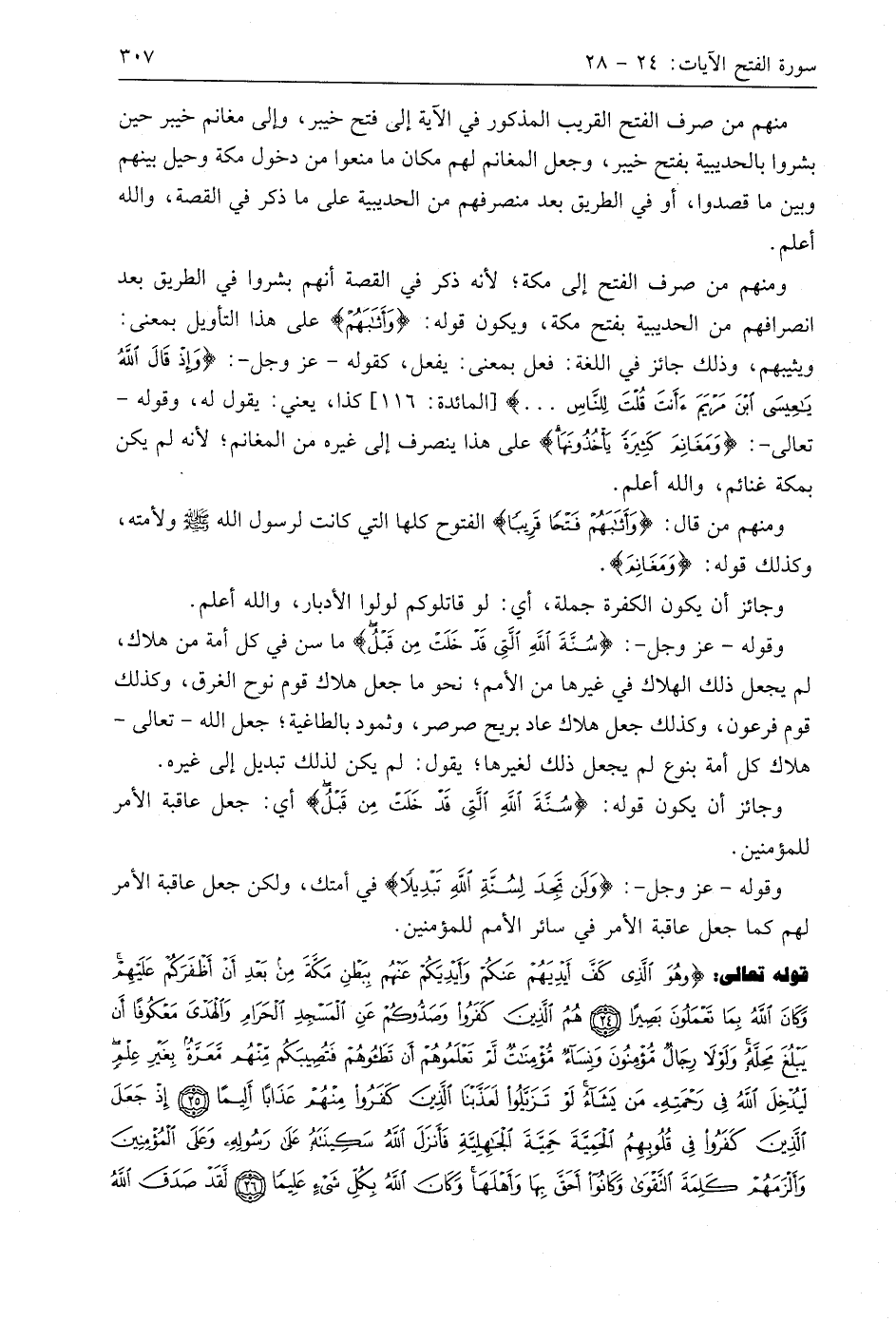 قوله تعالى: (وَهُوَ الَّذِي كَفَّ أَيْدِيَهُمْ عَنْكُمْ وَأَيْدِيَكُمْ عَنْهُمْ بِبَطْنِ مَكَّةَ مِنْ بَعْدِ أَنْ أَظْفَرَكُمْ عَلَيْهِمْ وَكَانَ اللَّهُ بِمَا تَعْمَلُونَ بَصِيرًا (24) هُمُ الَّذِينَ كَفَرُوا وَصَدُّوكُمْ عَنِ الْمَسْجِدِ الْحَرَامِ وَالْهَدْيَ مَعْكُوفًا أَنْ يَبْلُغَ مَحِلَّهُ وَلَوْلَا رِجَالٌ مُؤْمِنُونَ وَنِسَاءٌ مُؤْمِنَاتٌ لَمْ تَعْلَمُوهُمْ أَنْ تَطَئُوهُمْ فَتُصِيبَكُمْ مِنْهُمْ مَعَرَّةٌ بِغَيْرِ عِلْمٍ لِيُدْخِلَ اللَّهُ فِي رَحْمَتِهِ مَنْ يَشَاءُ لَوْ تَزَيَّلُوا لَعَذَّبْنَا الَّذِينَ كَفَرُوا مِنْهُمْ عَذَابًا أَلِيمًا (25) إِذْ جَعَلَ الَّذِينَ كَفَرُوا فِي قُلُوبِهِمُ الْحَمِيَّةَ حَمِيَّةَ الْجَاهِلِيَّةِ فَأَنْزَلَ اللَّهُ سَكِينَتَهُ عَلَى رَسُولِهِ وَعَلَى الْمُؤْمِنِينَ وَأَلْزَمَهُمْ كَلِمَةَ التَّقْوَى وَكَانُوا أَحَقَّ بِهَا وَأَهْلَهَا وَكَانَ اللَّهُ بِكُلِّ شَيْءٍ عَلِيمًا (26) لَقَدْ صَدَقَ اللَّهُ