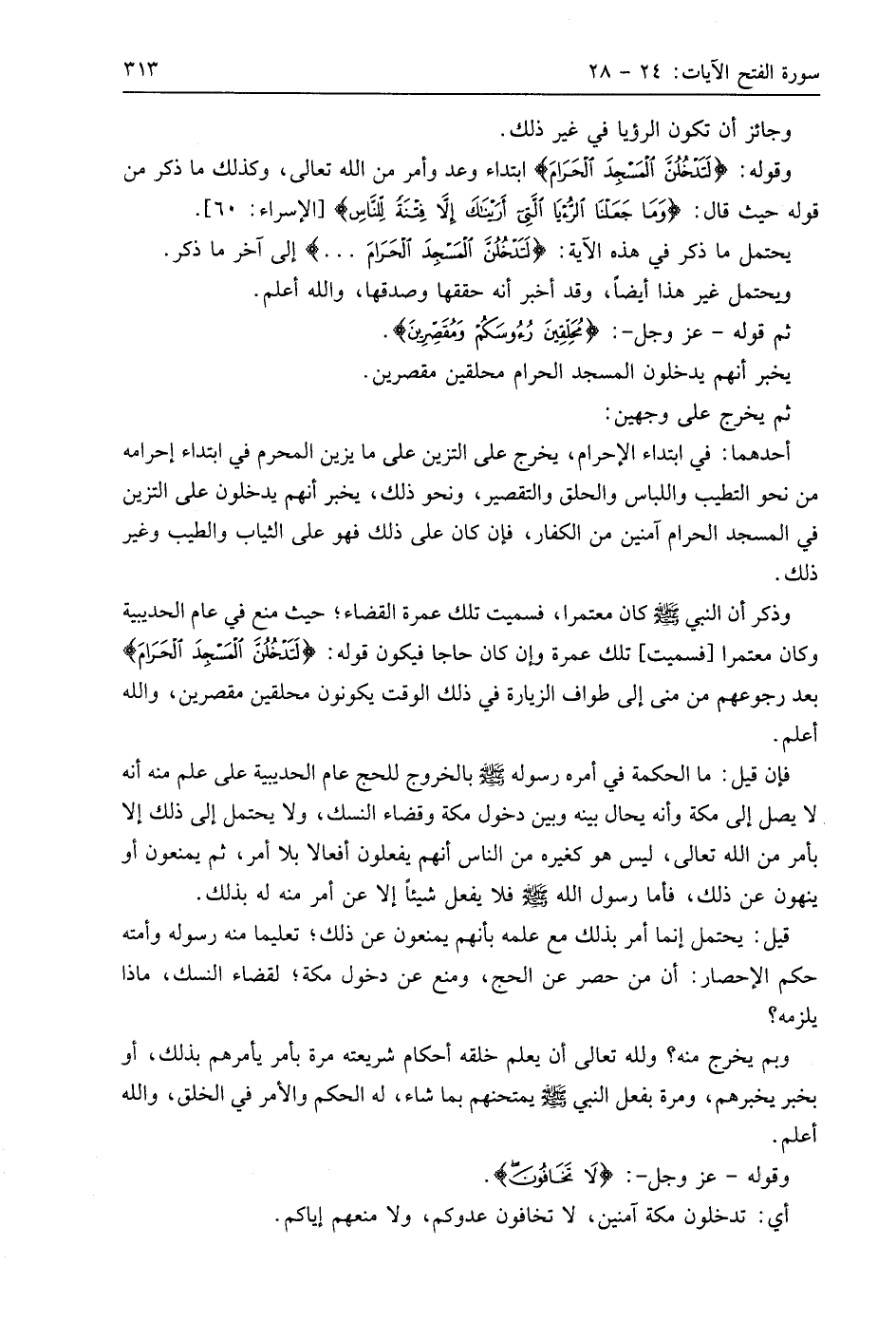 وذكر أن النبي - صَلَّى اللَّهُ عَلَيهِ وَسَلَّمَ - كان معتمرا، فسميت تلك عمرة القضاء؛ حيث منع في عام الحديبية وكان معتمرا فسميت، تلك عمرة وإن كان حاجا فيكون قوله: (لَتَدْخُلُنَّ الْمَسْجِدَ الْحَرَامَ) بعد رجوعهم من منى إلى طواف الزيارة في ذلك الوقت يكونون محلقين مقصرين، والله أعلم.