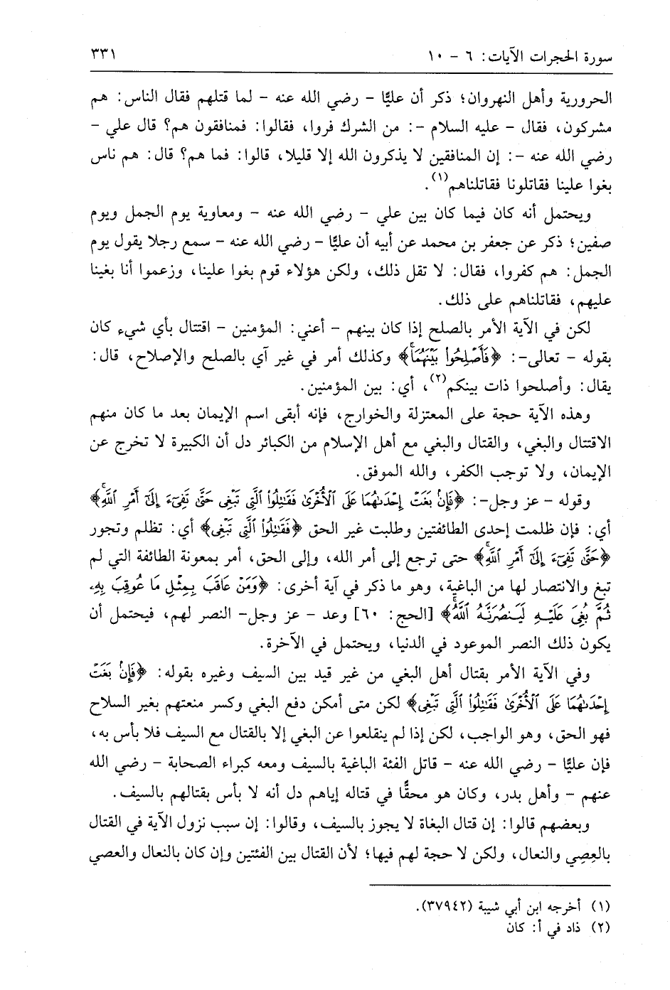 ويحتمل أنه كان فيما كان بين علي - رَضِيَ اللَّهُ عَنْهُ - ومعاوية يوم الجمل ويوم صفين؛ ذكر عن جعفر بن مُحَمَّد عن أبيه أن عليًّا - رَضِيَ اللَّهُ عَنْهُ - سمع رجلا يقول يوم الجمل: هم كفروا، فقال: لا تقل ذلك، ولكن هَؤُلَاءِ قوم بغوا علينا، وزعموا أنا بغينا عليهم، فقاتلناهم على ذلك.