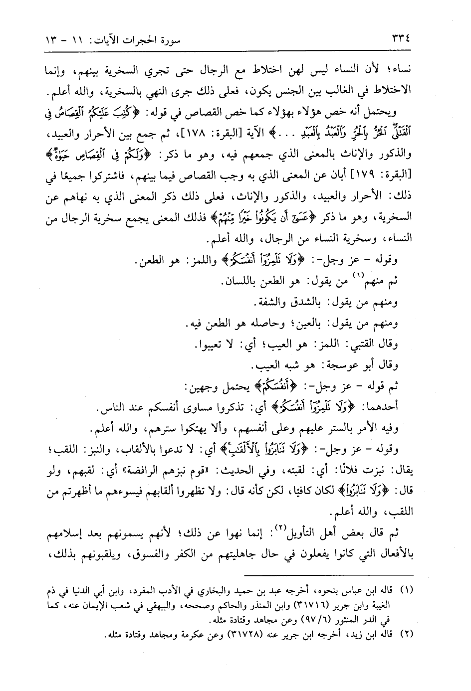 ويحتمل أنه خص هَؤُلَاءِ بهَؤُلَاءِ كما خص القصاص في قوله: (كُتِبَ عَلَيْكُمُ الْقِصَاصُ فِي الْقَتْلَى الْحُرُّ بِالْحُرِّ وَالْعَبْدُ بِالْعَبْدِ. . .) الآية، ثم جمع بين الأحرار والعبيد، والذكور والإناث بالمعنى الذي جمعهم فيه، وهو ما ذكر: (وَلَكُمْ فِي الْقِصَاصِ حَيَاةٌ)، أبان عن المعنى الذي به وجب القصاص فيما بينهم، فاشتركوا جميعًا في ذلك: الأحرار والعبيد، والذكور والإناث، فعلى ذلك ذكر المعنى الذي به نهاهم عن السخرية، وهو ما ذكر (عَسَى أَنْ يَكُونُوا خَيْرًا مِنْهُمْ) فذلك المعنى يجمع سخرية الرجال من النساء، وسخرية النساء من الرجال، واللَّه أعلم.