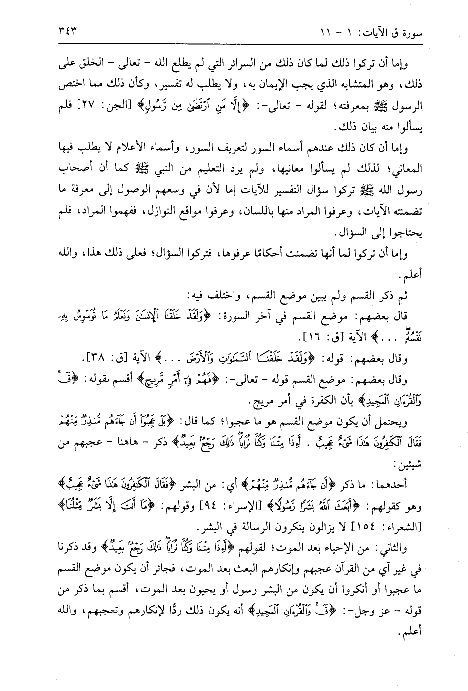 والثاني: من الإحياء بعد الموت؛ لقولهم (أَإِذَا مِتْنَا وَكُنَّا تُرَابًا ذَلِكَ رَجْعٌ بَعِيدٌ) وقد ذكرنا في غير آي من القرآن عجبهم وإنكارهم البعث بعد الموت، فجائز أن يكون موضع القسم ما عجبوا أو أنكروا أن يكون من البشر رسول أو يحيون بعد الموت، أقسم بما ذكر من قوله - عَزَّ وَجَلَّ -: (ق وَالْقُرْآنِ الْمَجِيدِ) أنه يكون ذلك ردًّا لإنكارهم وتعجبهم، والله أعلم.