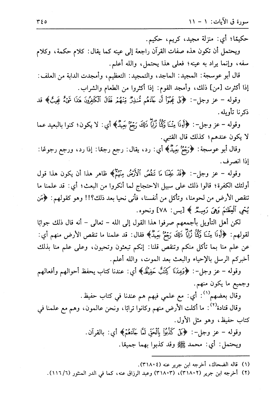 وقوله - عَزَّ وَجَلَّ -: (قَدْ عَلِمْنَا مَا تَنْقُصُ الْأَرْضُ مِنْهُمْ وَعِنْدَنَا كِتَابٌ حَفِيظٌ (4) ظاهر هذا أن يكون هذا قول أُولَئِكَ الكفرة؛ قالوا ذلك على سبيل الاحتجاج لما أنكروا من البعث؛ أي: قد علمنا ما تنقص الأرض من لحومنا، وتأكل من أنفسنا، فأنى نحيا بعد ذلك؟!! وهو كقولهم: (مَنْ يُحْيِ الْعِظَامَ وَهِيَ رَمِيمٌ)، ونحوه.