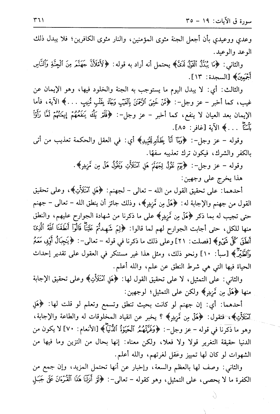 وقوله - عَزَّ وَجَلَّ -: (يَوْمَ نَقُولُ لِجَهَنَّمَ هَلِ امْتَلَأْتِ وَتَقُولُ هَلْ مِنْ مَزِيدٍ (30).
