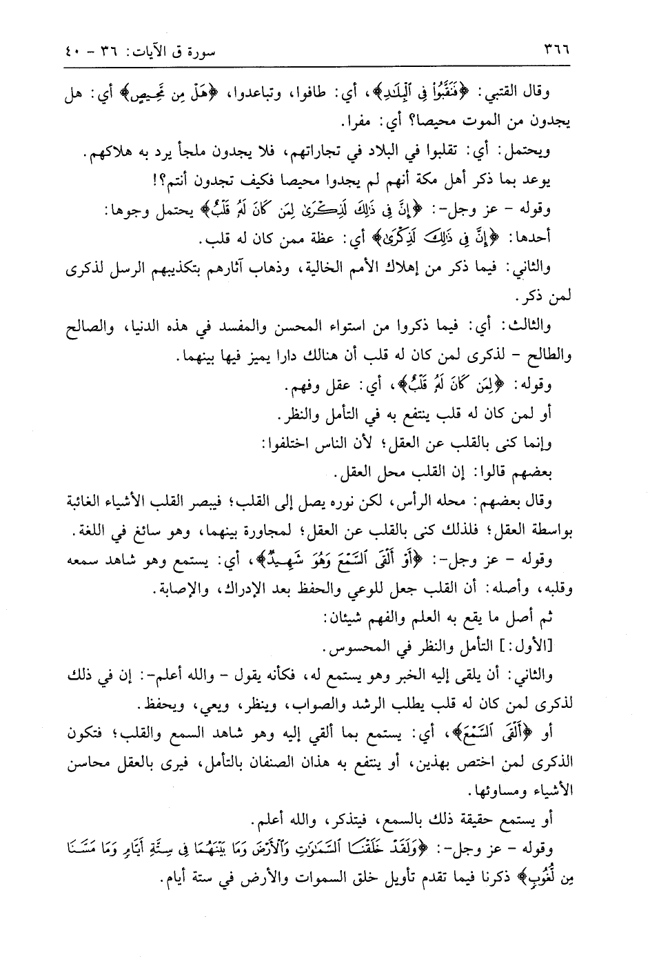وقَالَ الْقُتَبِيُّ: (فَنَقَّبُوا فِي الْبِلَادِ)، أي: طافوا، وتباعدوا، (هَلْ مِنْ مَحِيصٍ) أي: هل يجدون من الموت محيصا؟ أي: مفرًّا.
