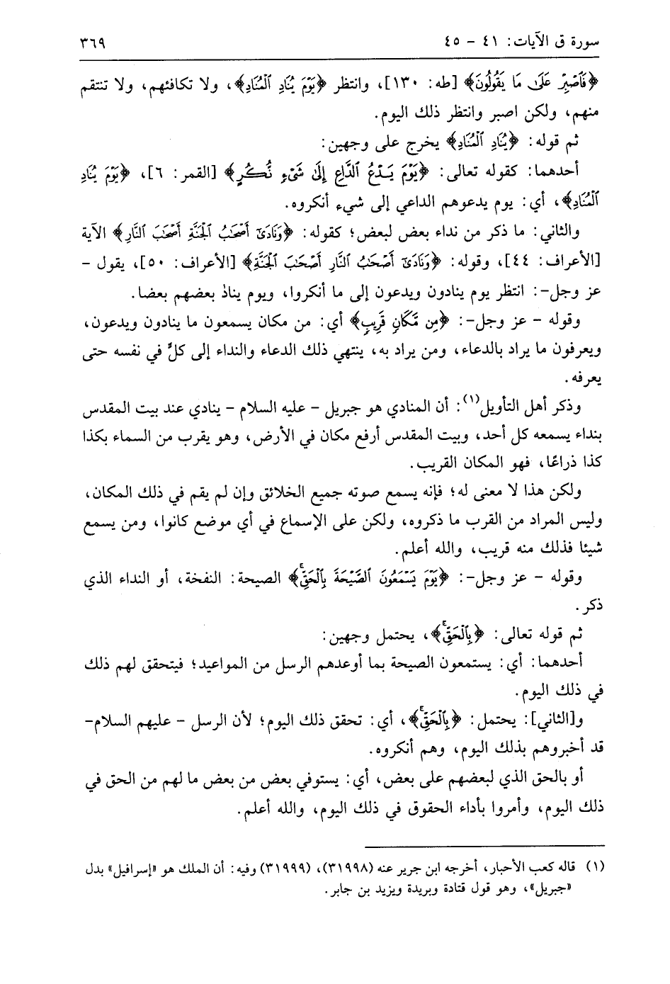 وذكر أهل التأويل: أن المنادي هو جبريل - عليه السلام - ينادي عند بيت المقدس بنداء يسمعه كل أحد، وبيت المقدس أرفع مكان في الأرض، وهو يقرب من السماء بكذا كذا ذراعًا، فهو المكان القريب.