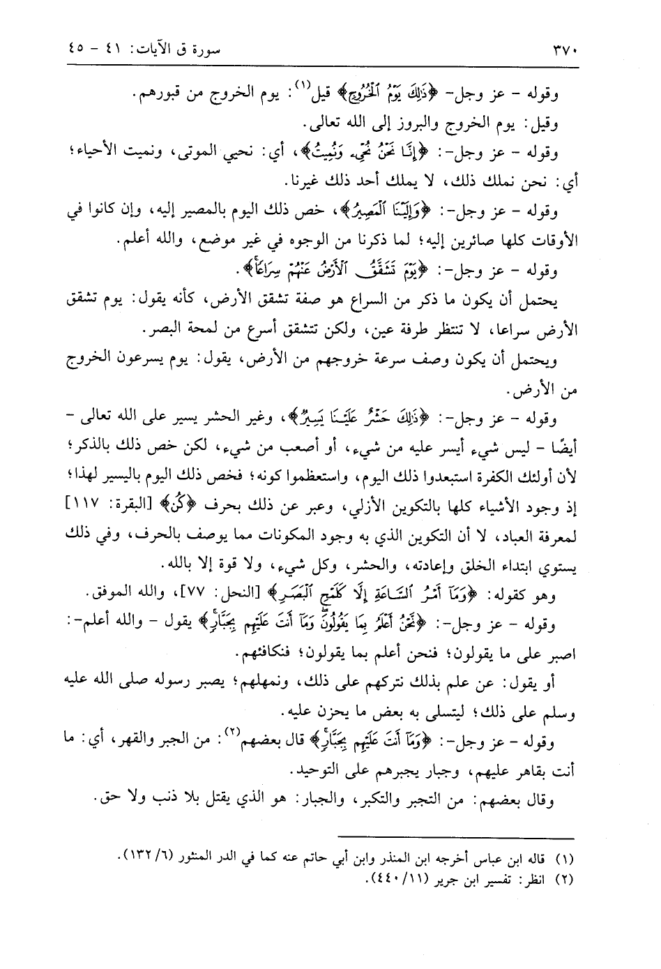 وقوله - عَزَّ وَجَلَّ -: (نَحْنُ أَعْلَمُ بِمَا يَقُولُونَ وَمَا أَنْتَ عَلَيْهِمْ بِجَبَّارٍ فَذَكِّرْ بِالْقُرْآنِ مَنْ يَخَافُ وَعِيدِ (45) يقول - واللَّه أعلم -: اصبر على ما يقولون؛ فنحن أعلم بما يقولون؛ فنكافئهم.