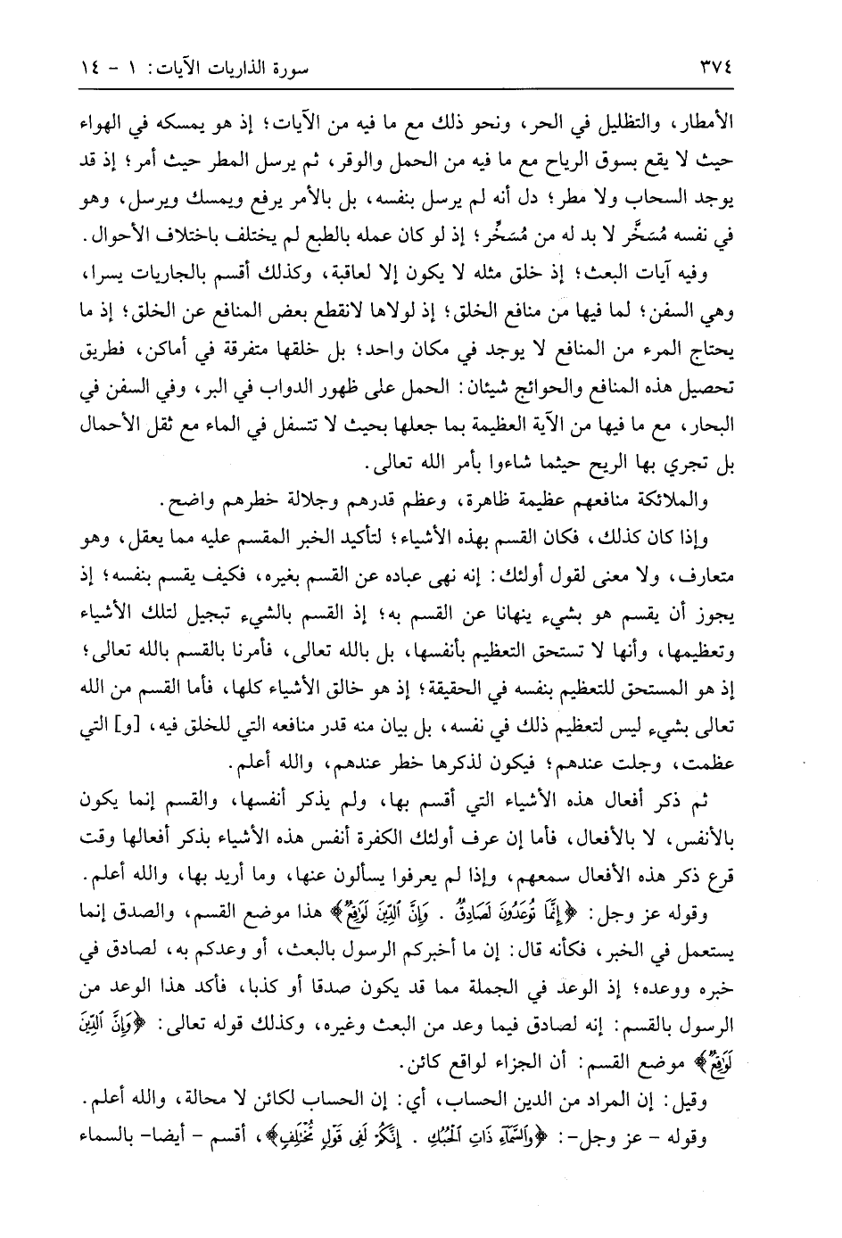 وفيه آيات البعث؛ إذ خلق مثله لا يكون إلا لعاقبة، وكذلك أقسم بالجاريات يسرا، وهي السفن؛ لما فيها من منافع الخلق؛ إذ لولاها لانقطع بعض المنافع عن الخلق؛ إذ ما يحتاج المرء من المنافع لا يوجد في مكان واحد؛ بل خلقها متفرقة في أماكن، فطريق تحصيل هذه المنافع والحوائج شيئان: الحمل على ظهور الدواب في البر، وفي السفن في البحار، مع ما فيها من الآية العظيمة بما جعلها بحيث لا تتسفل في الماء مع ثقل الأحمال بل تجري بها الريح حيثما شاءوا بأمر اللَّه تعالى.