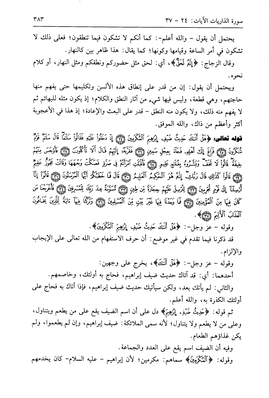 قوله تعالى: (هَلْ أَتَاكَ حَدِيثُ ضَيْفِ إِبْرَاهِيمَ الْمُكْرَمِينَ (24) إِذْ دَخَلُوا عَلَيْهِ فَقَالُوا سَلَامًا قَالَ سَلَامٌ قَوْمٌ مُنْكَرُونَ (25) فَرَاغَ إِلَى أَهْلِهِ فَجَاءَ بِعِجْلٍ سَمِينٍ (26) فَقَرَّبَهُ إِلَيْهِمْ قَالَ أَلَا تَأْكُلُونَ (27) فَأَوْجَسَ مِنْهُمْ خِيفَةً قَالُوا لَا تَخَفْ وَبَشَّرُوهُ بِغُلَامٍ عَلِيمٍ (28) فَأَقْبَلَتِ امْرَأَتُهُ فِي صَرَّةٍ فَصَكَّتْ وَجْهَهَا وَقَالَتْ عَجُوزٌ عَقِيمٌ (29) قَالُوا كَذَلِكِ قَالَ رَبُّكِ إِنَّهُ هُوَ الْحَكِيمُ الْعَلِيمُ (30) قَالَ فَمَا خَطْبُكُمْ أَيُّهَا الْمُرْسَلُونَ (31) قَالُوا إِنَّا أُرْسِلْنَا إِلَى قَوْمٍ مُجْرِمِينَ (32) لِنُرْسِلَ عَلَيْهِمْ حِجَارَةً مِنْ طِينٍ (33) مُسَوَّمَةً عِنْدَ رَبِّكَ لِلْمُسْرِفِينَ (34) فَأَخْرَجْنَا مَنْ كَانَ فِيهَا مِنَ الْمُؤْمِنِينَ (35) فَمَا وَجَدْنَا فِيهَا غَيْرَ بَيْتٍ مِنَ الْمُسْلِمِينَ (36) وَتَرَكْنَا فِيهَا آيَةً لِلَّذِينَ يَخَافُونَ الْعَذَابَ الْأَلِيمَ (37).