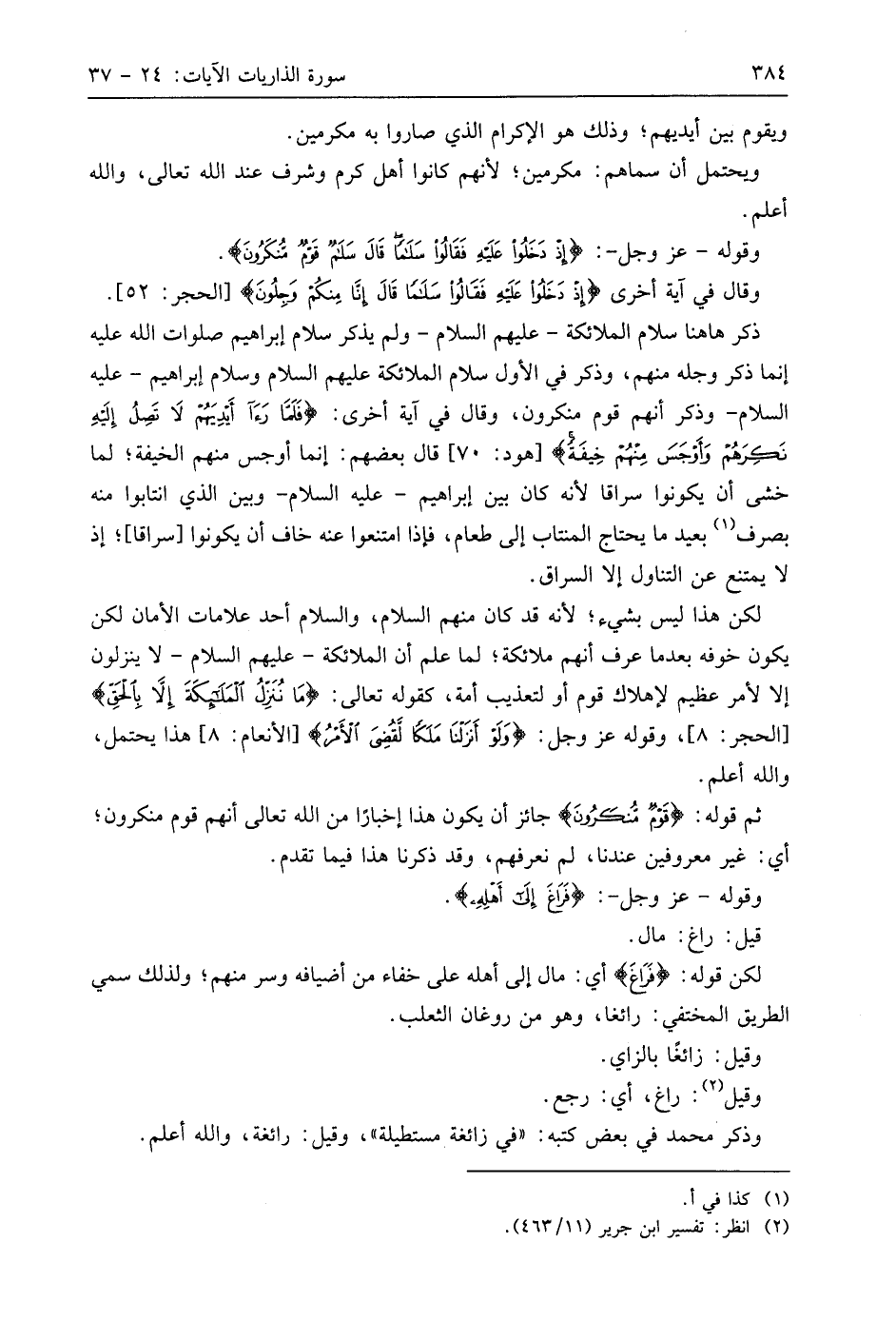 ذكر هاهنا سلام الملائكة - عليهم السلام - ولم يذكر سلام إبراهيم صلوات اللَّه عليه إنما ذكر وجله منهم، وذكر في الأول سلام الملائكة عليهم السلام وسلام إبراهيم - عليه السلام - وذكر أنهم قوم منكرون، وقال في آية أخرى: (فَلَمَّا رَأَى أَيْدِيَهُمْ لَا تَصِلُ إِلَيْهِ نَكِرَهُمْ وَأَوْجَسَ مِنْهُمْ خِيفَةً) قَالَ بَعْضُهُمْ: إنما أوجس منهم الخيفة؛ لما خشي أن يكونوا سراقا لأنه كان بين إبراهيم - عليه السلام - وبين الذي انتابوا منه بصرف بعيد ما يحتاج المنتاب إلى طعام، فإذا امتنعوا عنه خاف أن يكونوا سراقا؛ إذ لا يمتنع عن التناول إلا السراق.