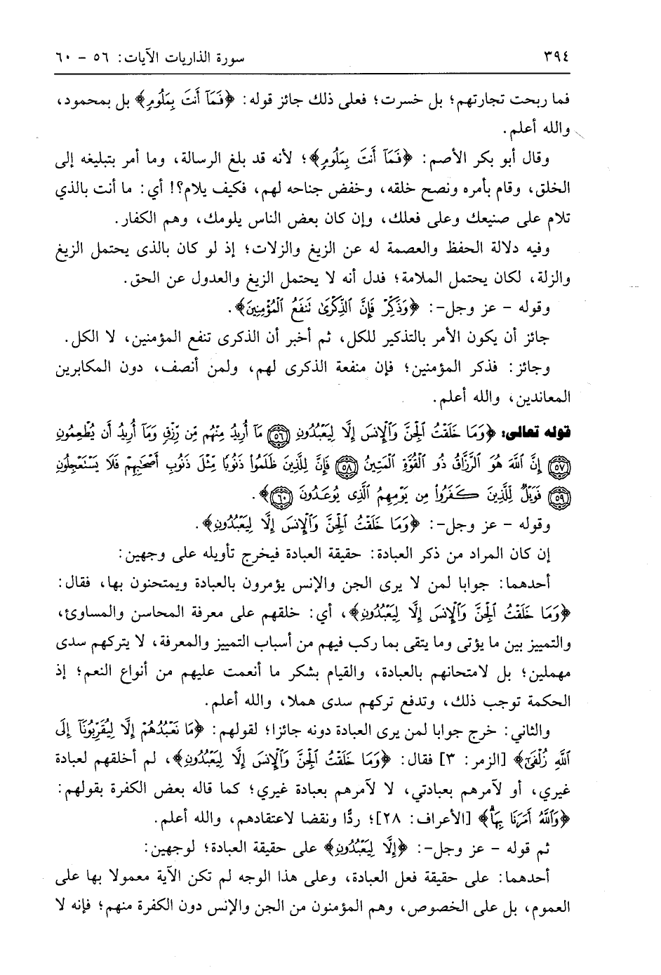 والثاني: خرج جوابا لمن يرى العبادة دونه جائزا؛ لقولهم: (مَا نَعْبُدُهُمْ إِلَّا لِيُقَرِّبُونَا إِلَى اللَّهِ زُلْفَى)، فقال: (وَمَا خَلَقْتُ الْجِنَّ وَالْإِنْسَ إِلَّا لِيَعْبُدُونِ)، لم أخلقهم لعبادة غيري، أو لآمرهم بعبادتي، لا لآمرهم بعبادة غيري؛ كما قاله بعض الكفرة بقولهم: (وَاللَّهُ أَمَرَنَا بِهَا)؛ ردًّا ونقضا لاعتقادهم، واللَّه أعلم.