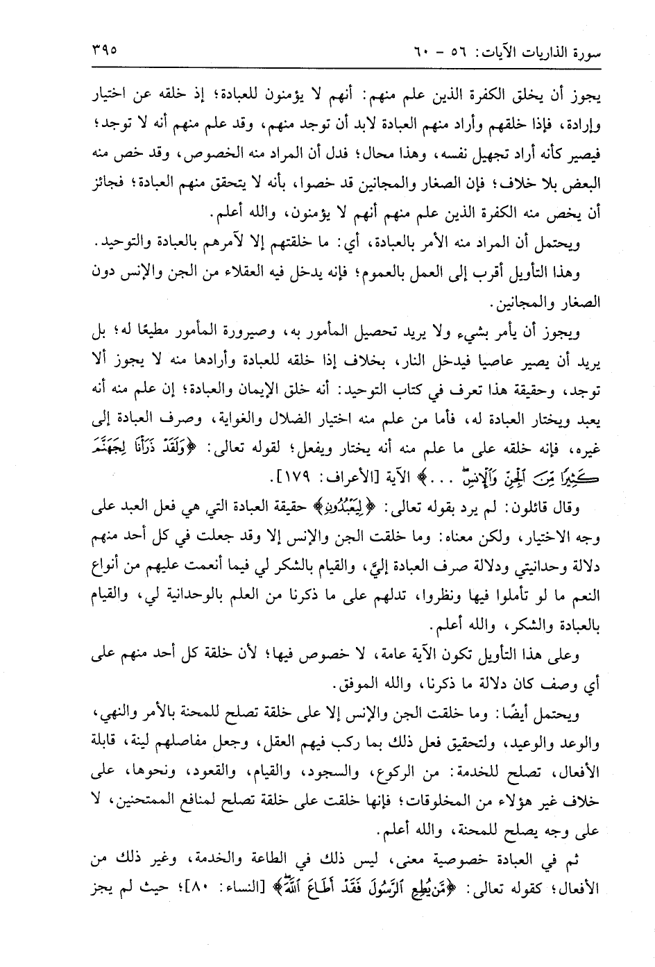 وقال قائلون: لم يرد بقوله تعالى: (لِيَعْبُدُونِ) حقيقة العبادة التي، هي فعل العبد على وجه الاختيار، ولكن معناه: وما خلقت الجن والإنس إلا وقد جعلت في كل أحد منهم دلالة وحدانيتي ودلالة صرف العبادة إليَّ، والقيام بالشكر لي فيما أنعمت عليهم من أنواع النعم ما لو تأملوا فيها ونظروا، تدلهم على ما ذكرنا من العلم بالوحدانية لي، والقيام بالعبادة والشكر، واللَّه أعلم.