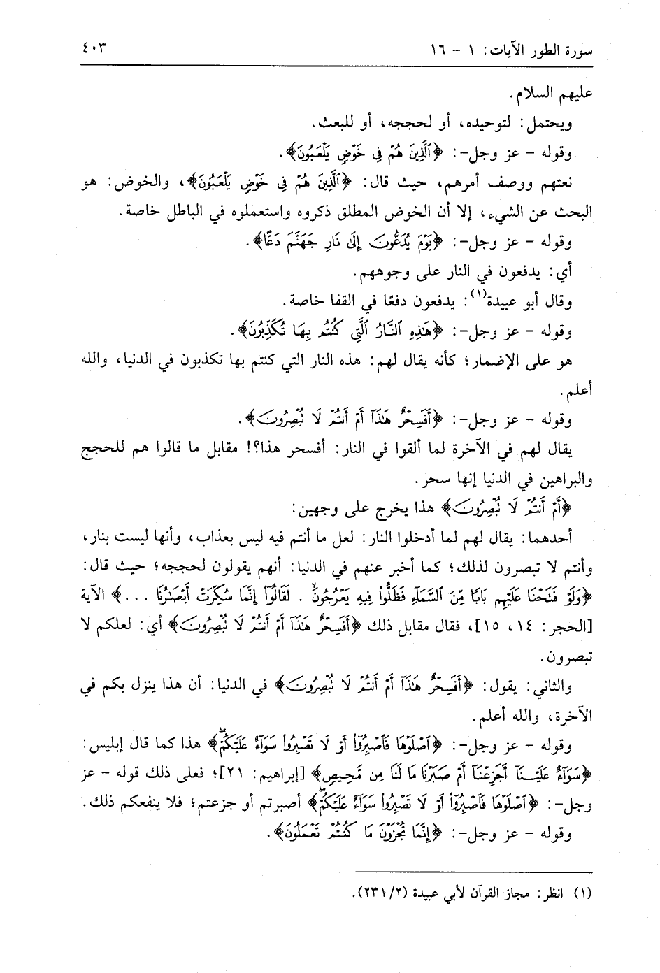 وقوله - عَزَّ وَجَلَّ -: (اصْلَوْهَا فَاصْبِرُوا أَوْ لَا تَصْبِرُوا سَوَاءٌ عَلَيْكُمْ ... (16) هذا كما قال إبليس: (سَوَاءٌ عَلَيْنَا أَجَزِعْنَا أَمْ صَبَرْنَا مَا لَنَا مِنْ مَحِيصٍ)؛ فعلى ذلك قوله - عز وجل -: (اصْلَوْهَا فَاصْبِرُوا أَوْ لَا تَصْبِرُوا سَوَاءٌ عَلَيْكُمْ) أصبرتم أو جزعتم؛ فلا ينفعكم ذلك.