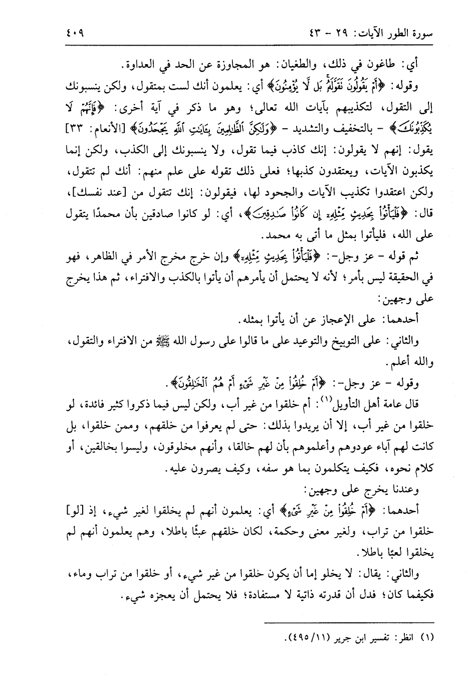 وقوله: (أَمْ يَقُولُونَ تَقَوَّلَهُ بَلْ لَا يُؤْمِنُونَ (33) أي: يعلمون أنك لست بمتقول، ولكن ينسبونك إلى التقول، لتكذيبهم بآيات اللَّه تعالى؛ وهو ما ذكر في آية أخرى: (فَإِنَّهُمْ لَا يُكَذِّبُونَكَ) -بالتخفيف والتشديد- (وَلَكِنَّ الظَّالِمِينَ بِآيَاتِ اللَّهِ يَجْحَدُونَ)، يقول: إنهم لا يقولون: إنك كاذب فيما تقول، ولا ينسبونك إلى الكذب، ولكن إنما يكذبون الآيات، ويعتقدون كذبها؛ فعلى ذلك تقوله على علم منهم: أنك لم تتقول، ولكن اعتقدوا تكذيب الآيات والجحود لها، فيقولون: إنك تتقول من أعند نفسك، قال: (فَلْيَأْتُوا بِحَدِيثٍ مِثْلِهِ إِنْ كَانُوا صَادِقِينَ (34) أي: لو كانوا صادقين بأن محمدًا يتقول على اللَّه، فليأتوا بمثل ما أتى به مُحَمَّد - صَلَّى اللَّهُ عَلَيهِ وَسَلَّمَ -.
