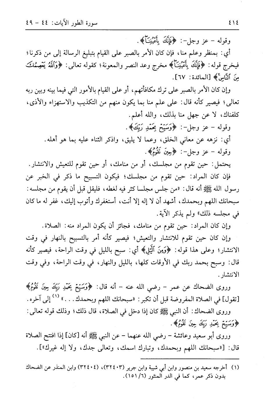 وروى الضحاك عن عمر - رَضِيَ اللَّهُ عَنْهُ - أنه قال: (وَسَبِّحْ بِحَمْدِ رَبِّكَ حِينَ تَقُومُ) تقول في الصلاة المفروضة قبل أن تكبر: " سبحانك اللهم وبحمدك. . . " إلى آخره.